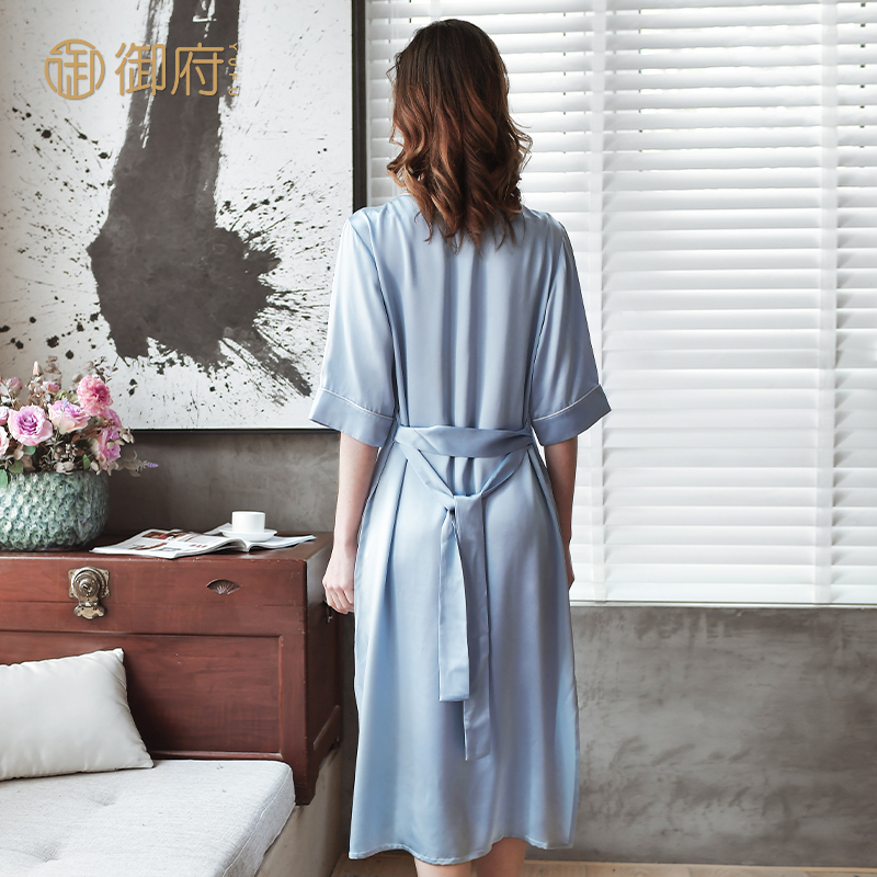 Yufu heavy long version mid-sleeve silk nightdress women's summer lace-up 100% mulberry silk nightdress high-end silk nightgown