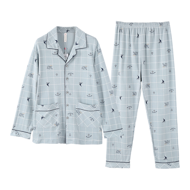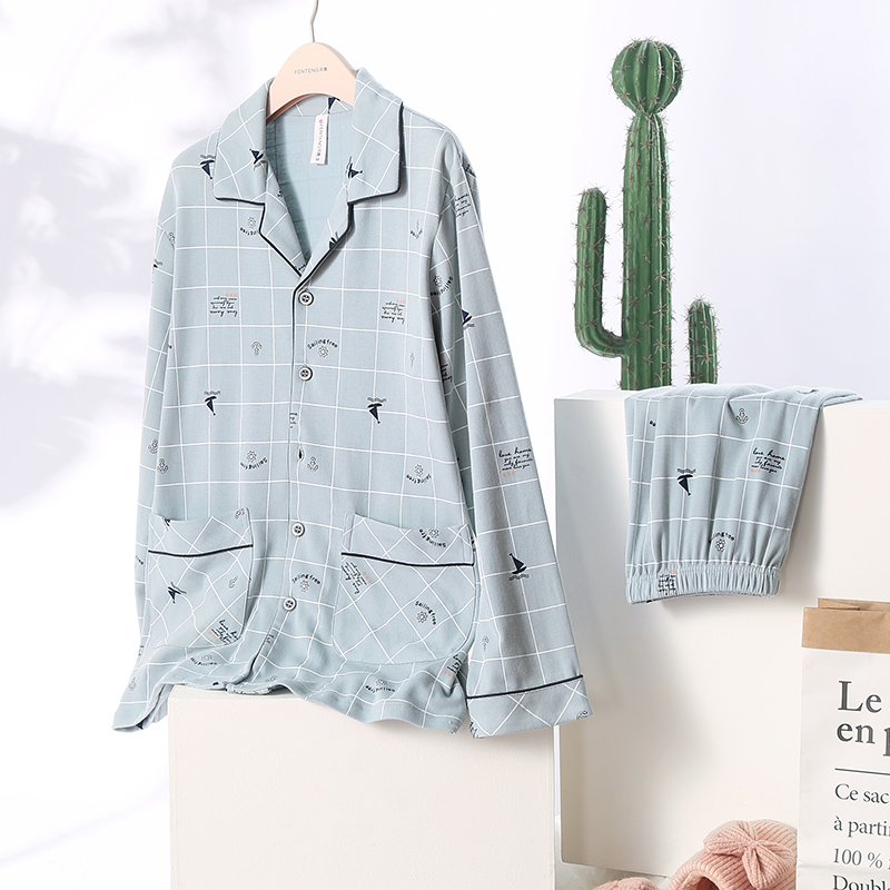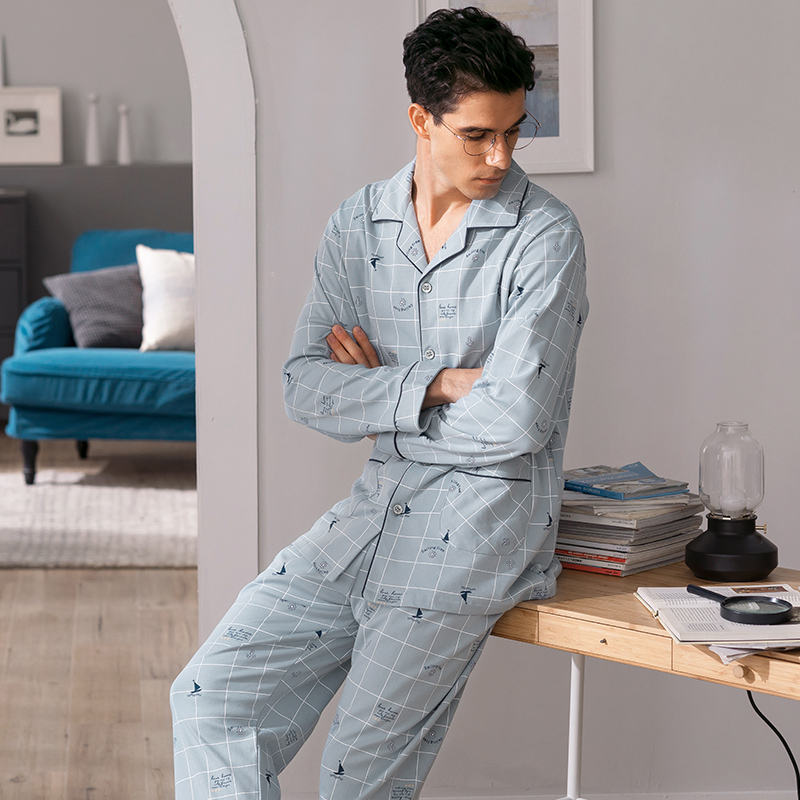 Fending Spring and Autumn Sleeved Sleeper Men Sweater Pure Cotton Household Clothes for Fall and Winter Men Young Grid All-Cotton Large Size Set