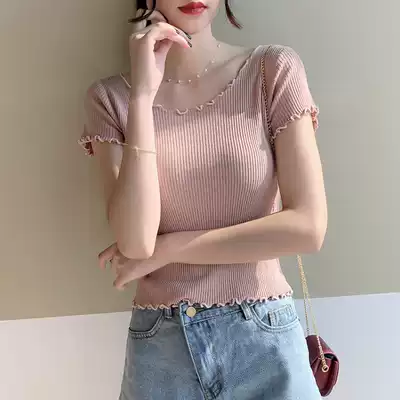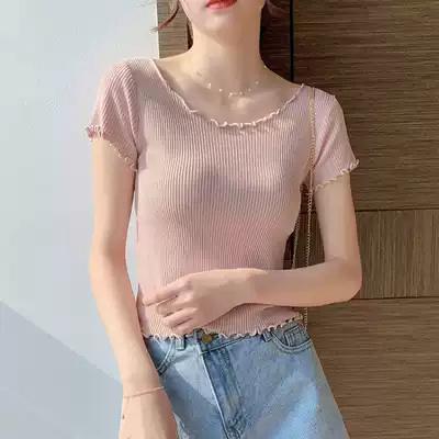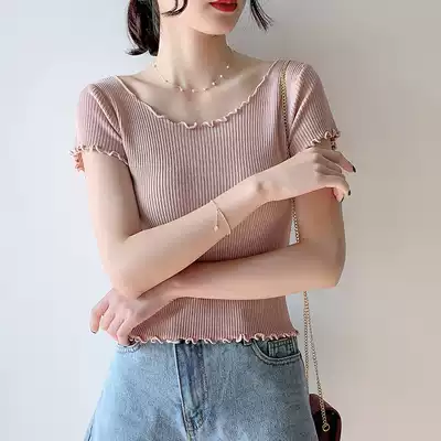 Knitted short-sleeved T-shirt Women summer 2021 New slim wooden ear belly button Ice Silk Lotus neck top