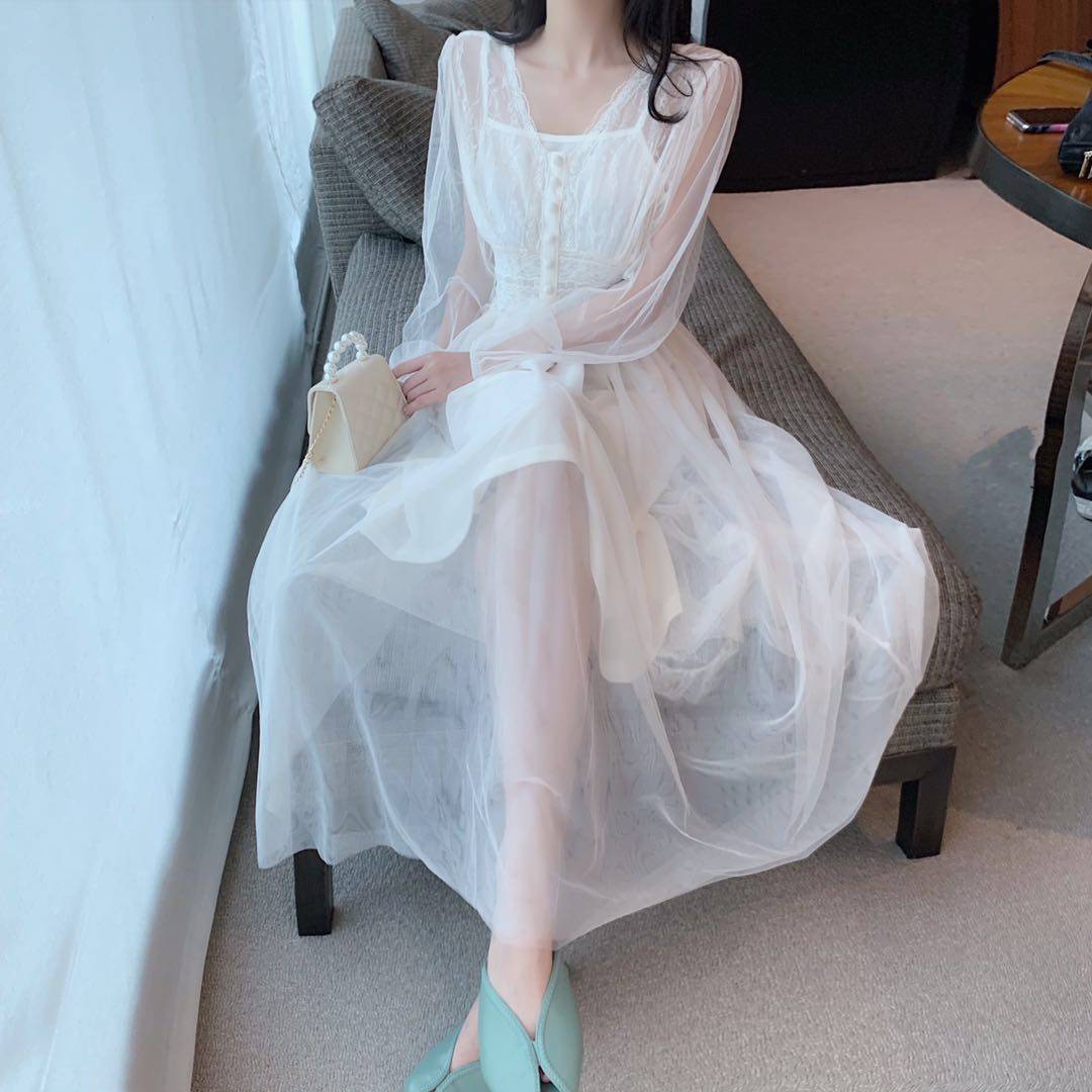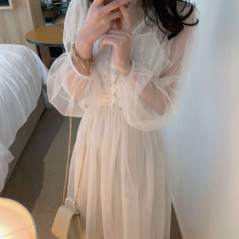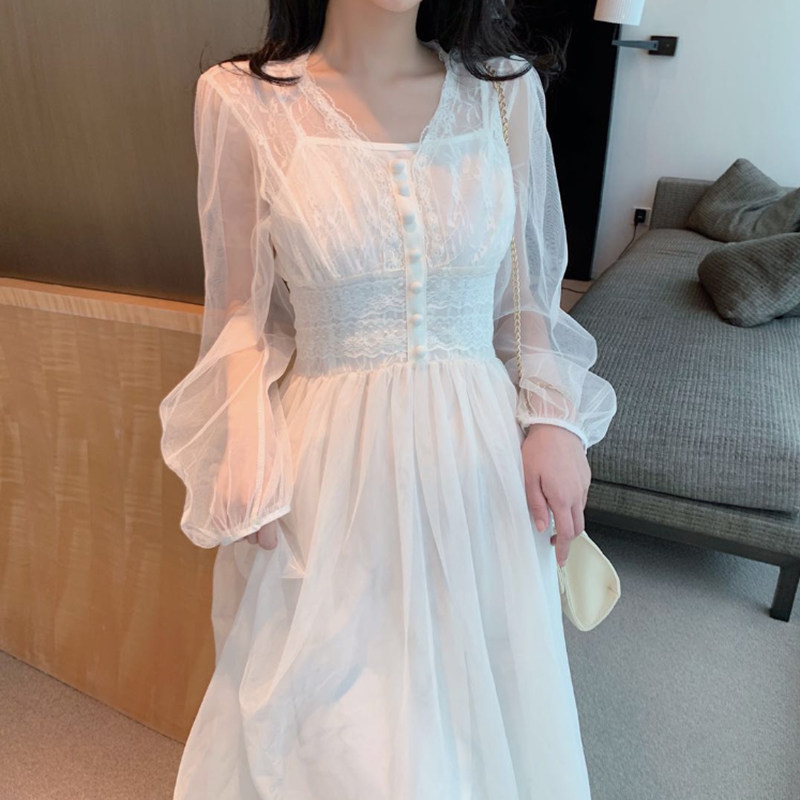 Law-style first love sweet and windy with women 2021 Xia Art and art light cooked palace wind collection waist display slim lace white long dress