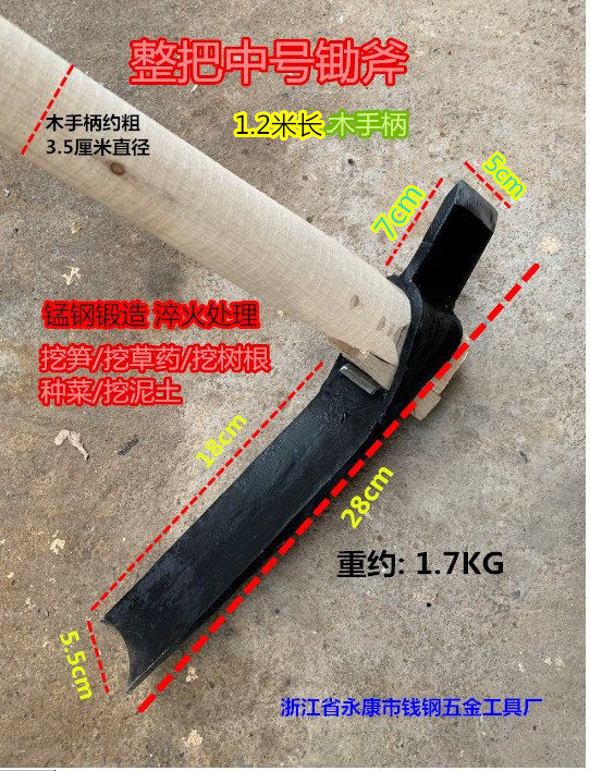 Large single hoe about 2.3 kg Medium single hoe about 1.5 kg Whole large hoe 1 meter long handle Medium hoe 1.2 m long handle Weighted closing manganese steel separate hoe (about 2.8 kg) Large spring steel separate hoe (about 2.7 kg) Medium mouth hoe (about 1.1 kg) Large wide mouth hoe (about 2.2 kg) Spring steel Universal hoe (about 2.3 kg) Large universal closing style (about 2 kg) Whole forged spring steel hoe (about 4.5 kg) Wide mouth small individual hoe axe (about 1.2 kg) medium Wide-mouth hoe (about 1.8 kg) Medium narrow mouth single hoe (about 1.6 kg) Small Spring steel hoe (about 1.5 kg) 3 kg bearing steel forging hoe Extended weight