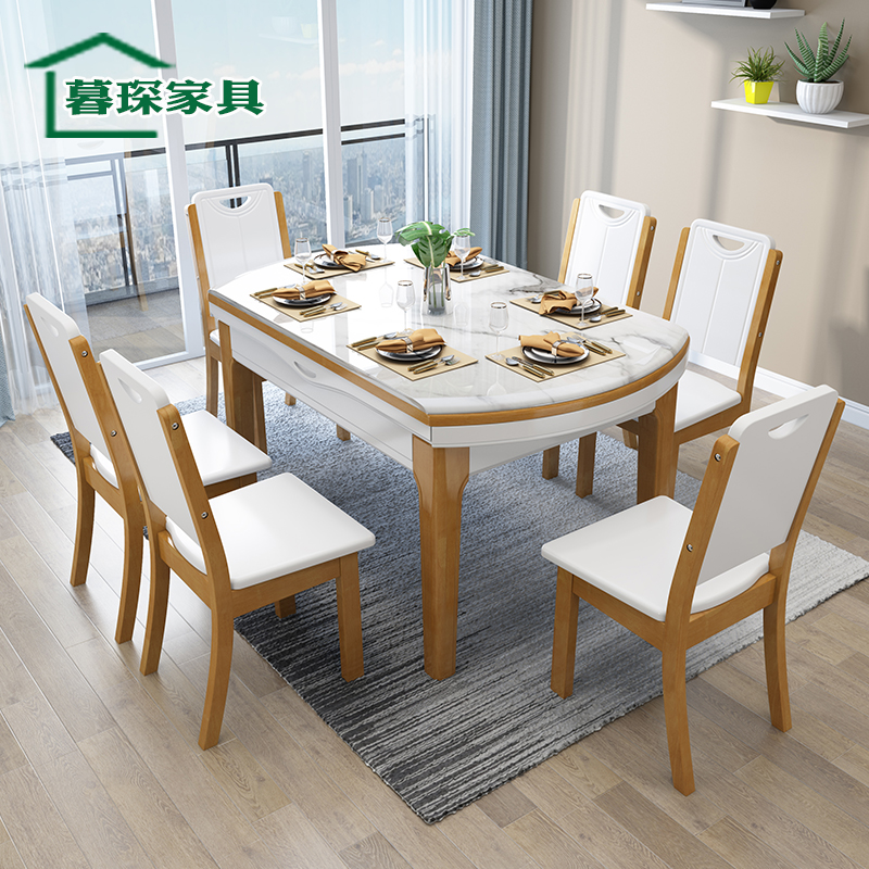 Marble dining table and chair combination folding solid wood round table modern simple rice table household small apartment telescopic table
