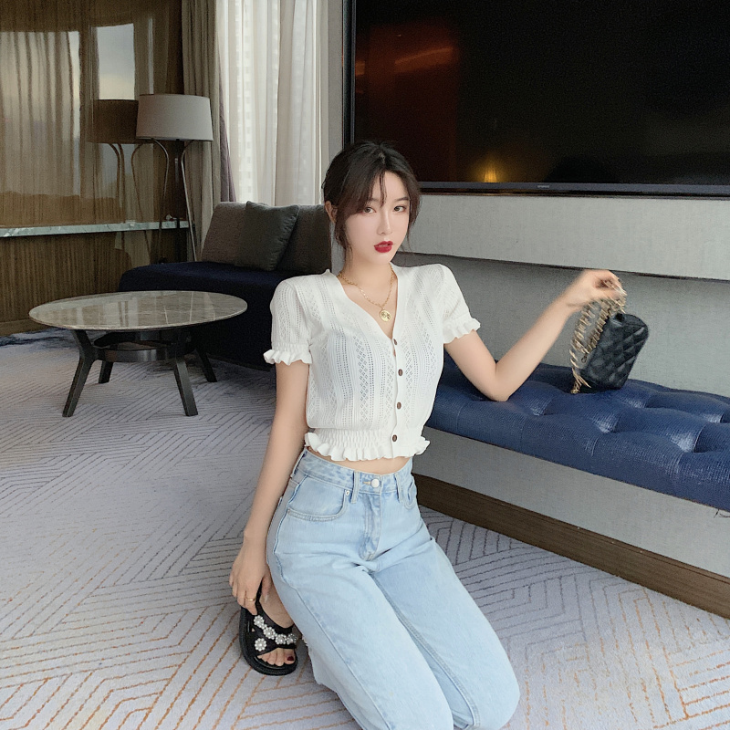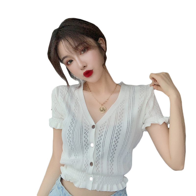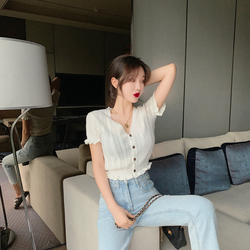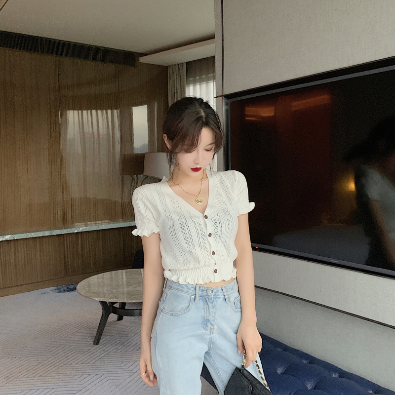 Summer white cardiovert 2021 new V collar short Lazy Wind Hollowed-out Slim 100 hitch cardiovert t-shirt T-shirt