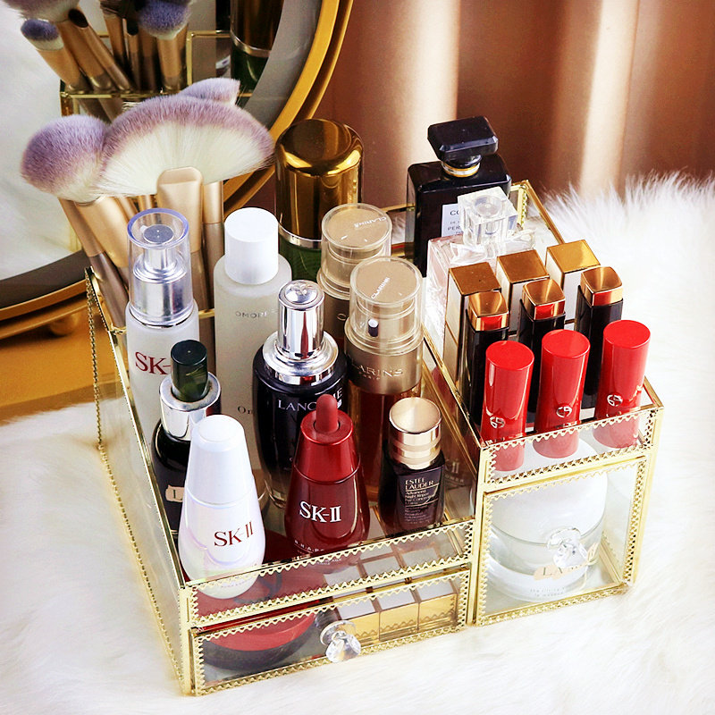 European-style glass cosmetic storage box desktop household copper edge lipstick skin care finishing box transparent beauty brush bucket