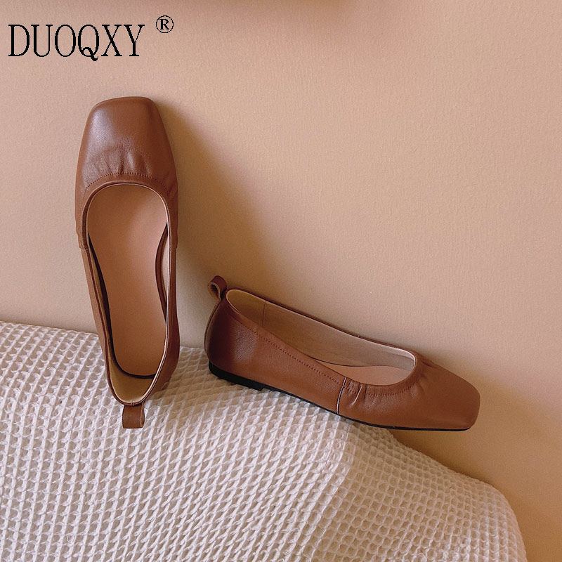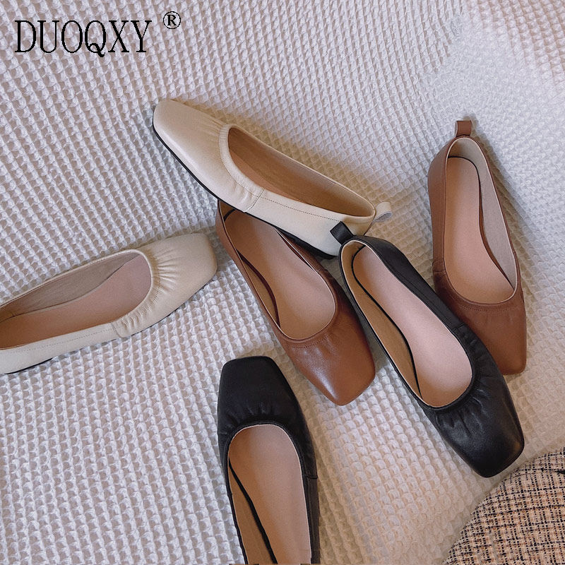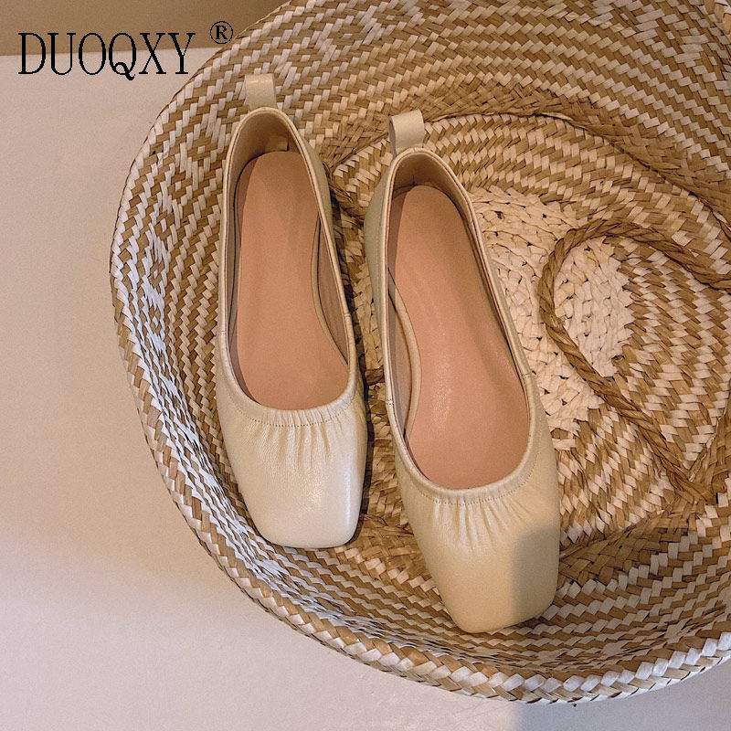 Spring leather white single shoes square toe soft leather shallow mouth flat bottom grandma shoes soft bottom small leather shoes flat heel art women's shoes