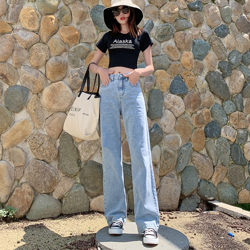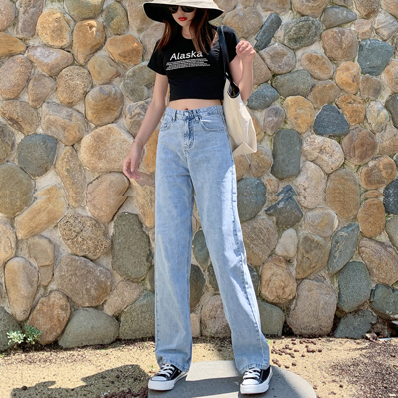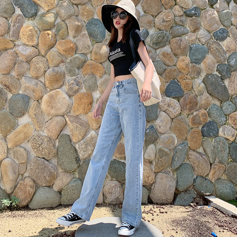 High-waisted jeans women's straight loose ripped hole spring and autumn new trendy thin and high light casual wide pants drape