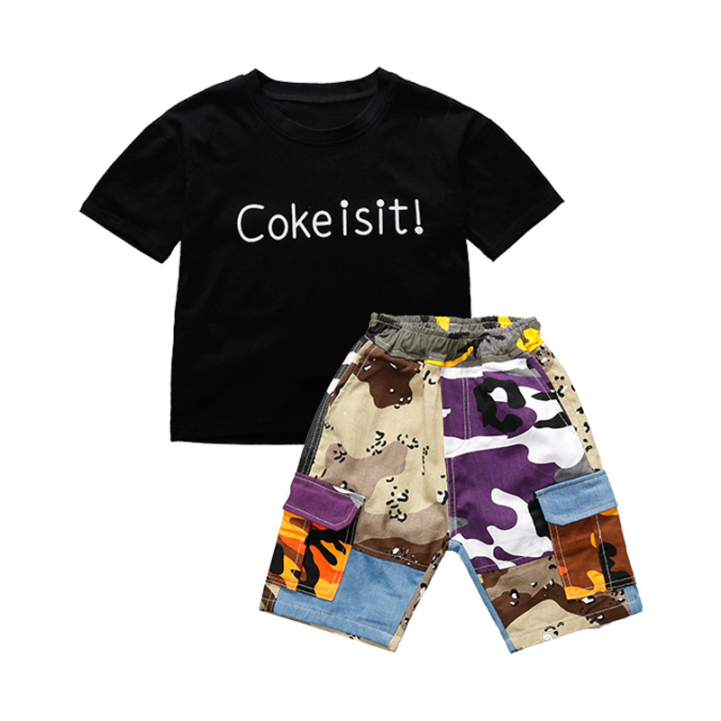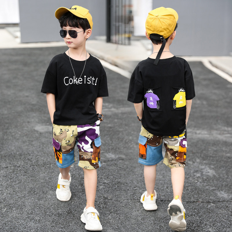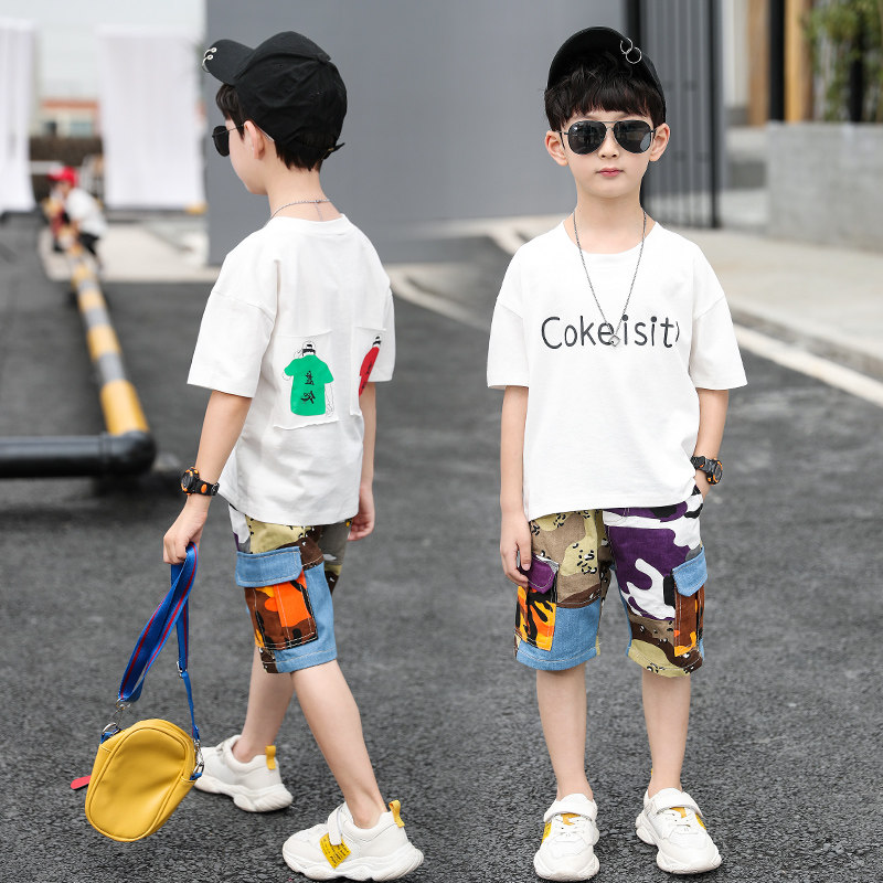 Boys summer suit 2020 new children's t-shirt large children's short-sleeved denim shorts foreign school boys tooling tide