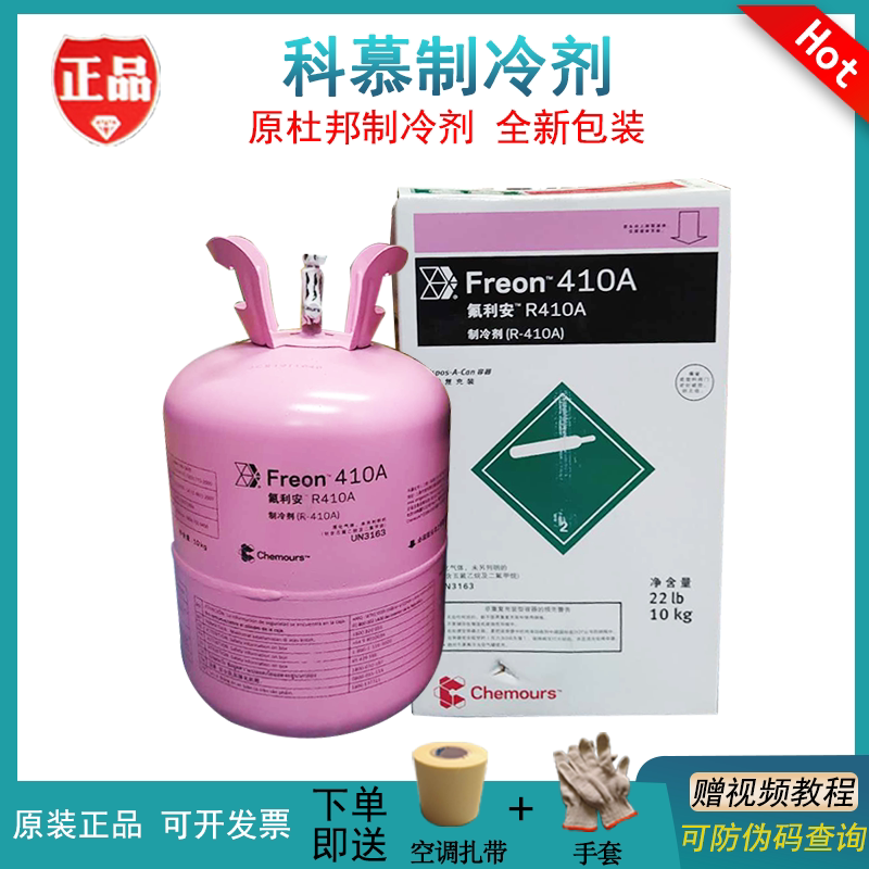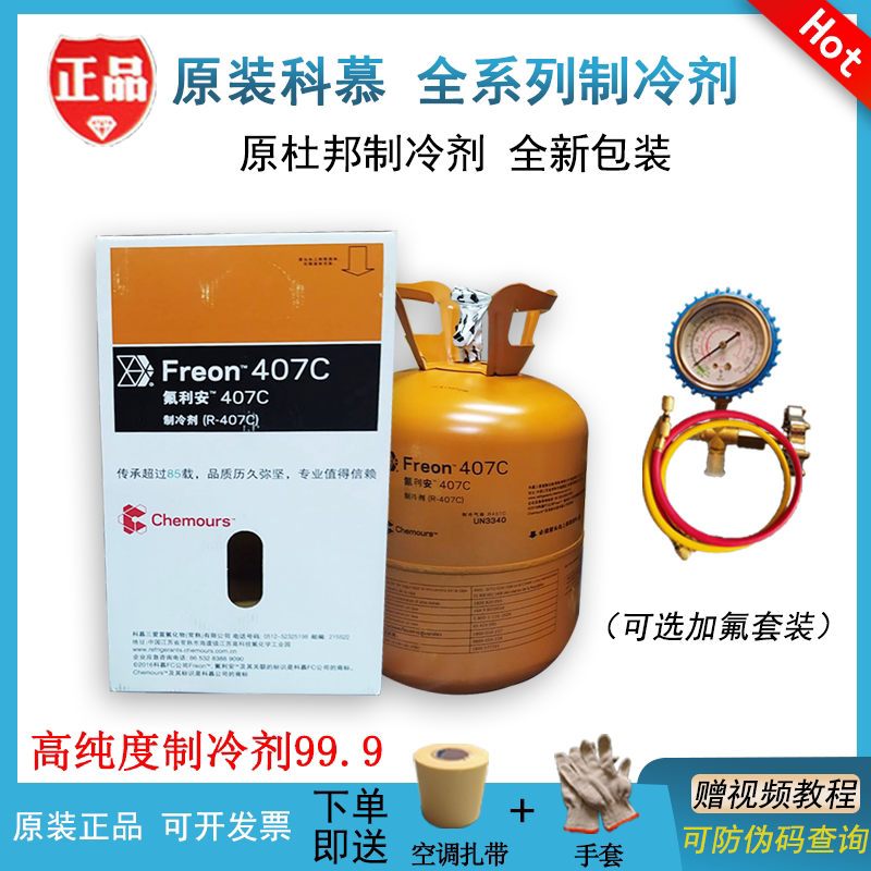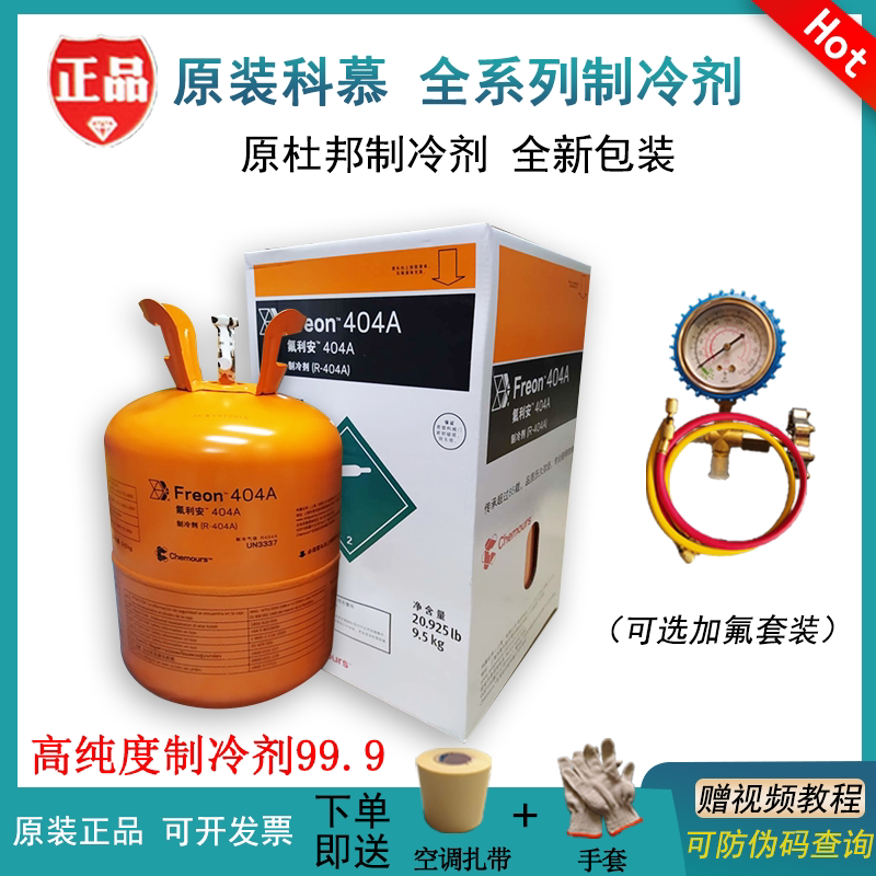 Chemours R404A net weight 9.5kg + cable tie gloves Chemours R404A net weight 9.5kg (with tools) Chemours R407C net weight 10kg + tie-feeding gloves Chemours R407C net weight 10kg (with tools) Chemours R410A net weight 10kg + tie-feeding gloves Chemours R410A net weight 10kg (with tools) Chemours 134a net weight 13.5kg + strapping gloves Chemours 134a net weight 13.5kg (with tools) Chemours R22 net weight 22.3kg+ Tie-feeding gloves Chemours R22 net weight 22.3kg (with tool)