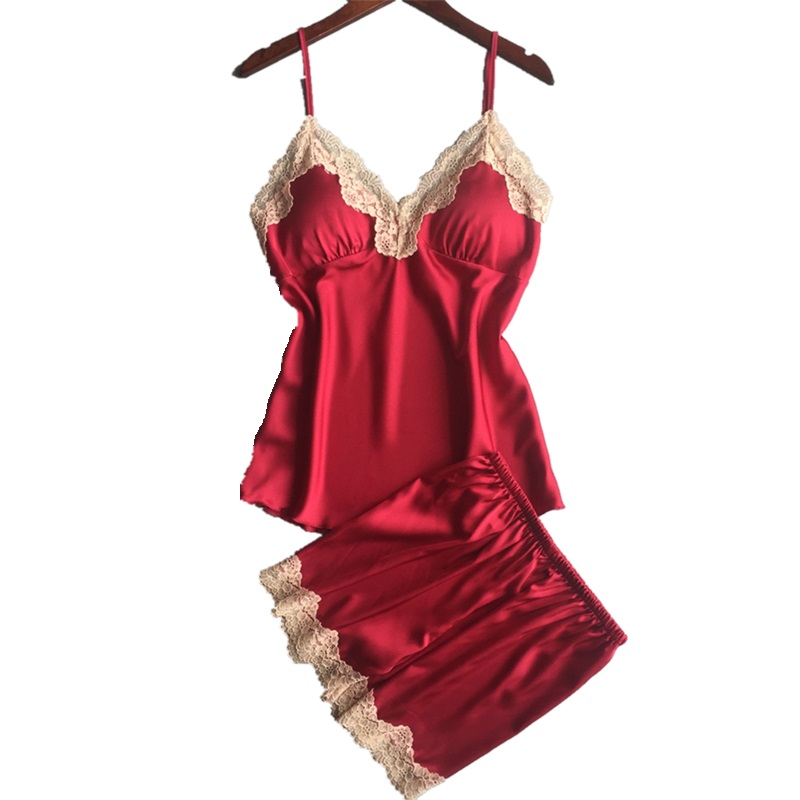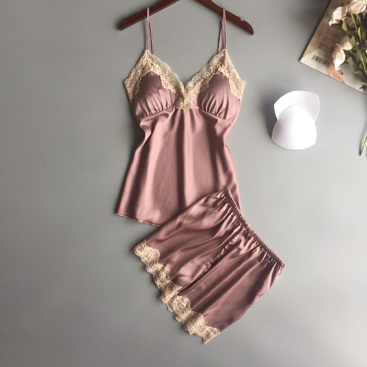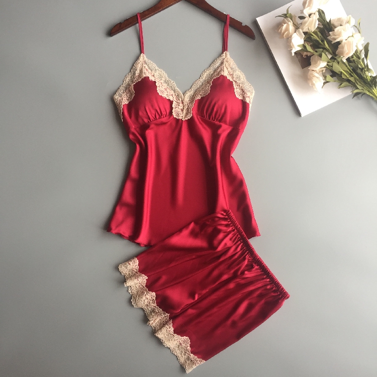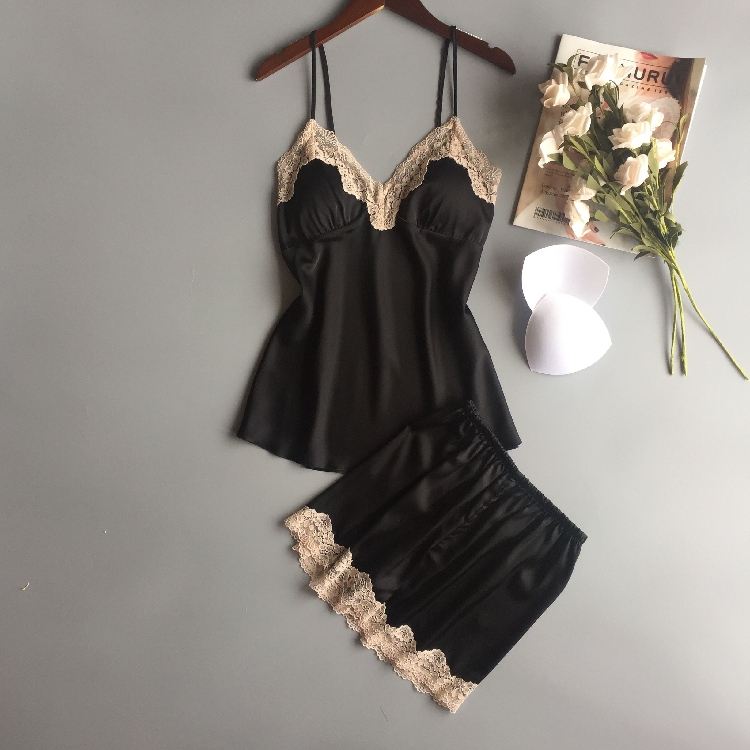 Spring new women's thin ice silk pajamas suspenders shorts suit summer sexy and cute two lace flower home clothes