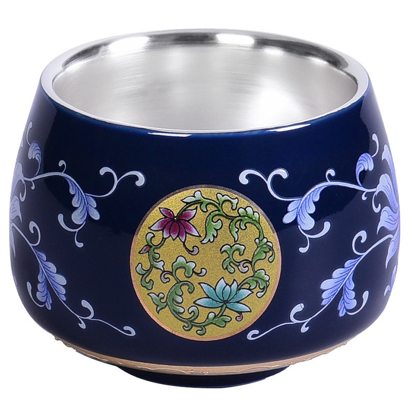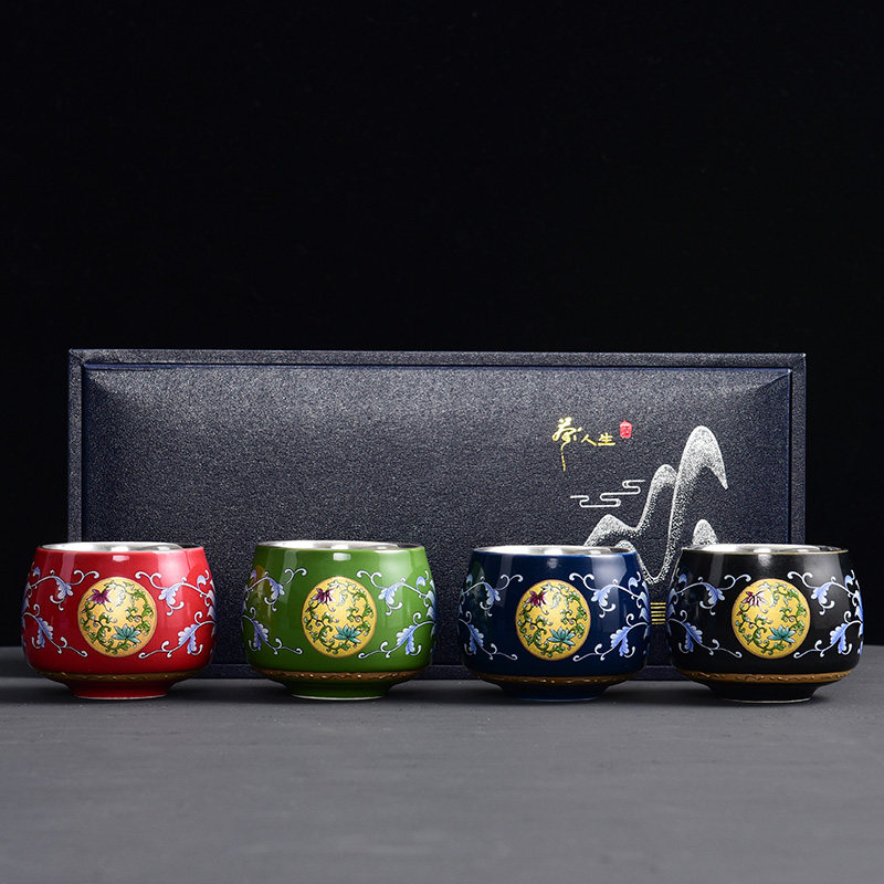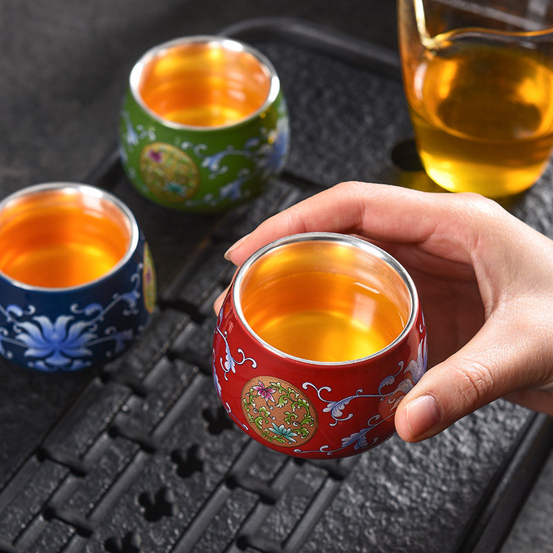 Enamel color gilt silver tea cup ceramic silver cup Jingdezhen sterling silver teacup Kung Fu teacup master cup drinking teacup