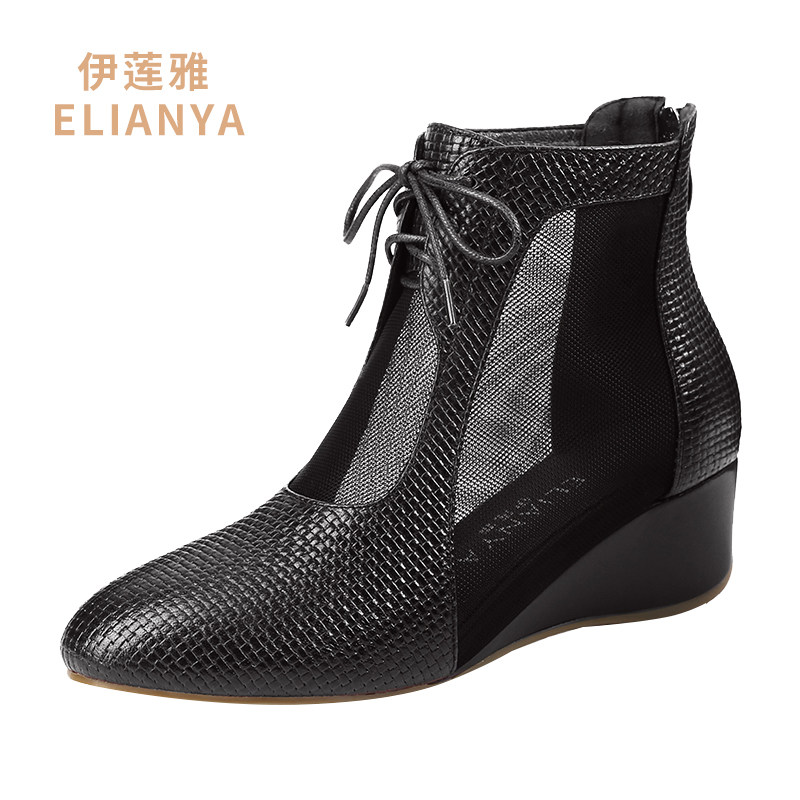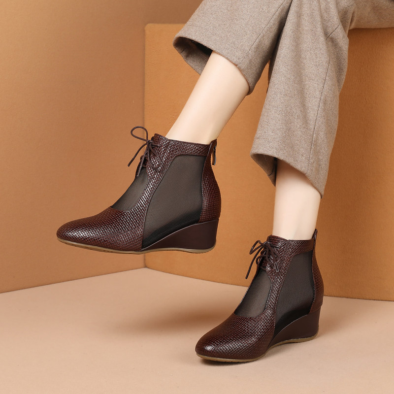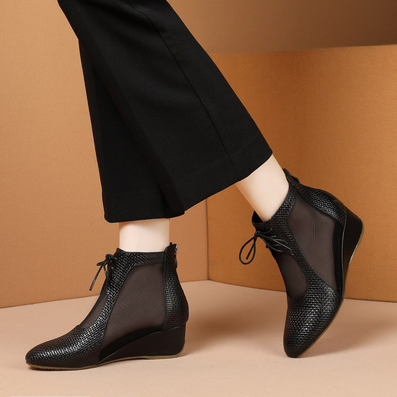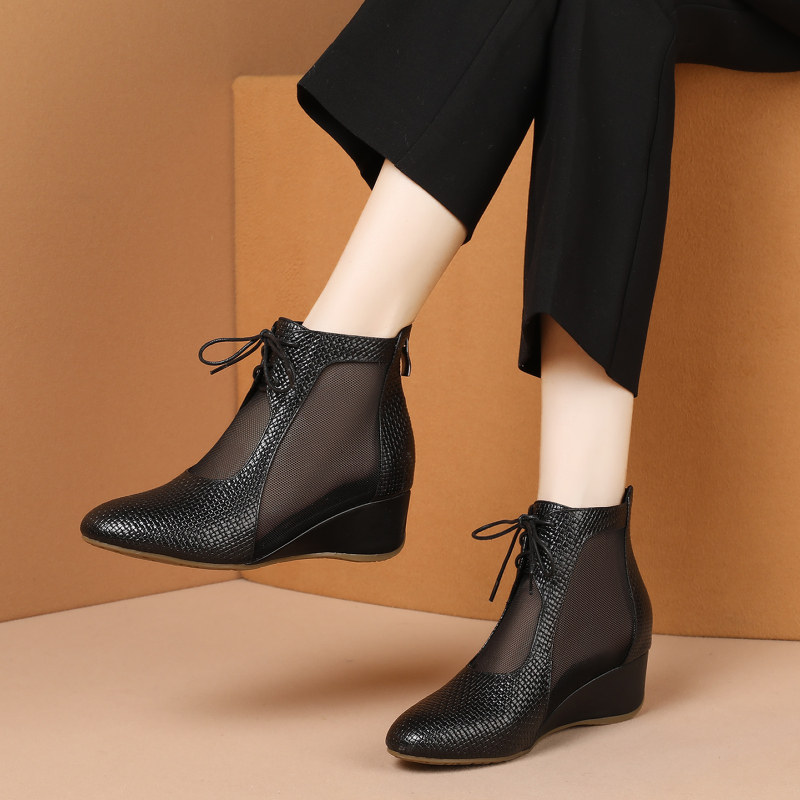 Slope heel sandals spring and summer hollow net boots round leather mesh boots in old mom heel shoes