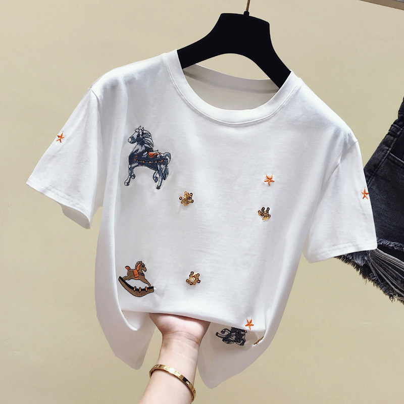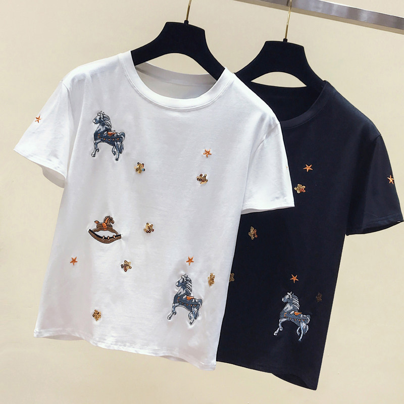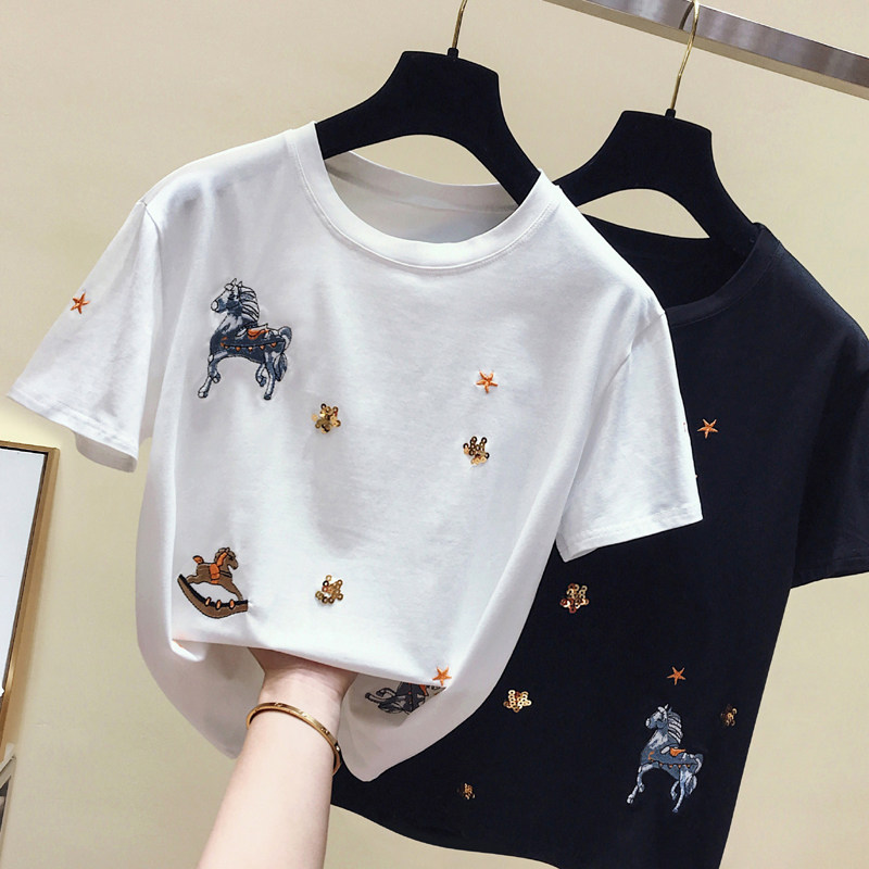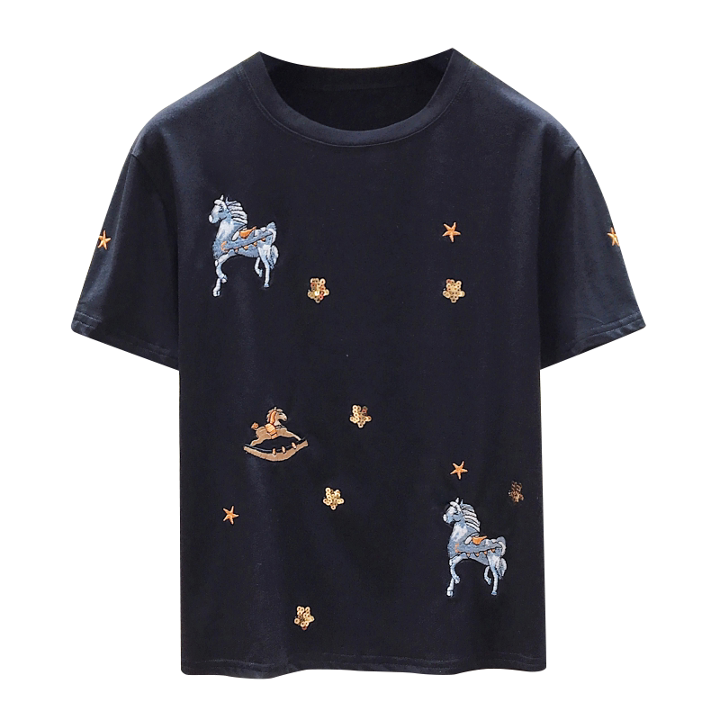 South Korea Black Short Sleeve T-shirt Lady Han Version Pure Cotton 100 Lap Loose Design Sensation Blouse 2021 Summer New Tide