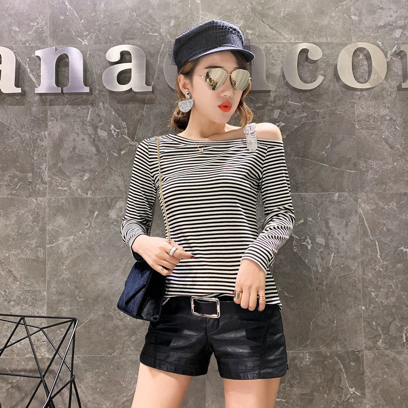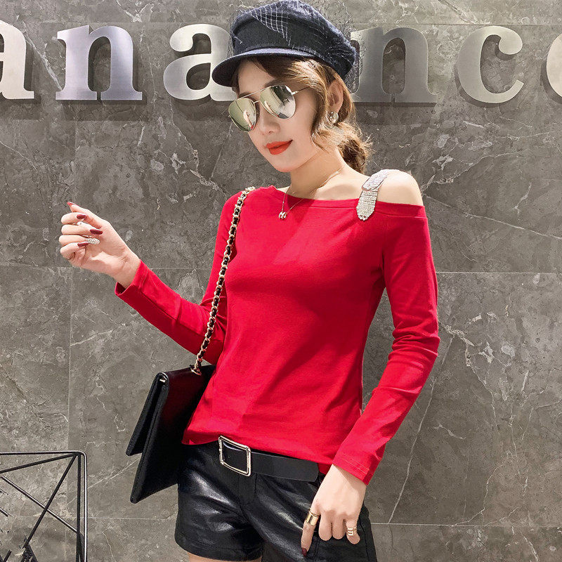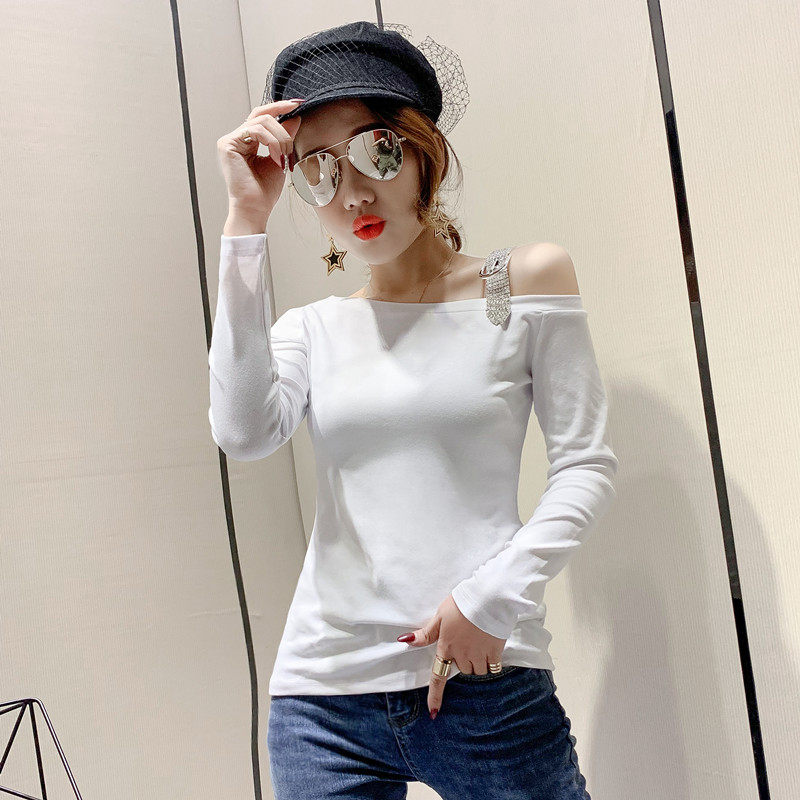 South Korea 2020 spring and summer new sexy one-word collar short sleeve T-shirt woman dress long sleeve swarm with undershirt and shoulder blouse