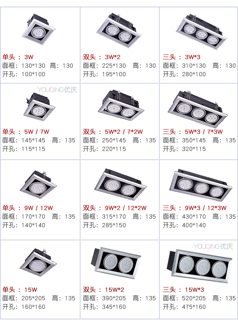 Double head 2 * 12w (hole 14 * 28 5) cob double head 2 * 20w (16 5 * 35) three heads 3 * 7w (hole 11 5 * 32) cob double head