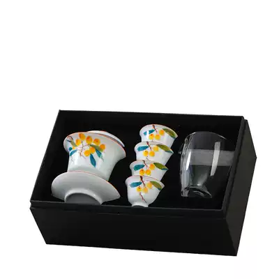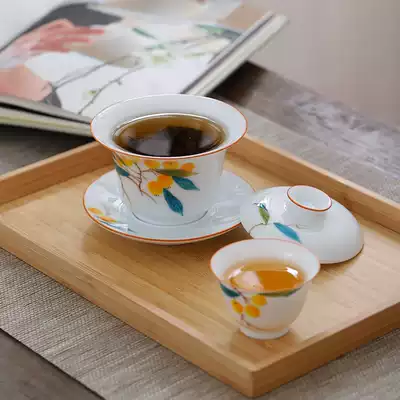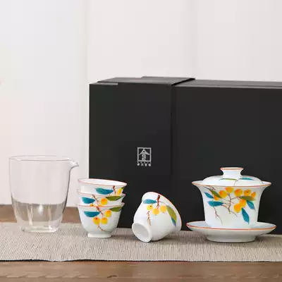 Japanese tea set Jingdezhen hand-painted three-cai Gaiwan Kung Fu tea set Living room household simple modern gift box