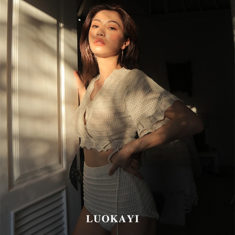 Swimsuit women's 2022 new wave sexy knit two-piece two-piece set lace-edge revealing navel personality ultra-slim honeymoon swimsuit