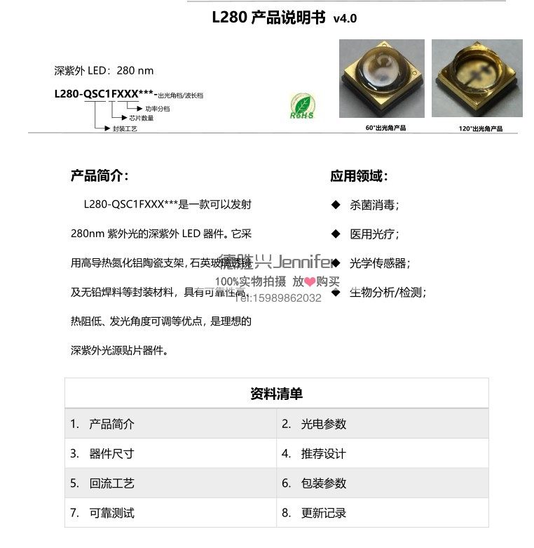 UVC lamp bead 275nm 270nm 280nm UV sterilization lamp 12MW 60 degrees ball head quartz light