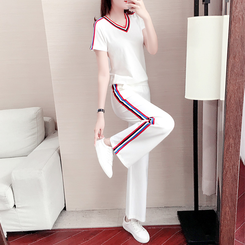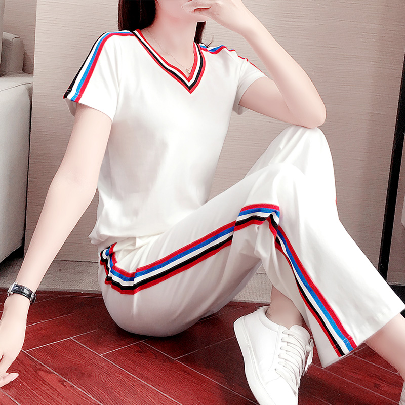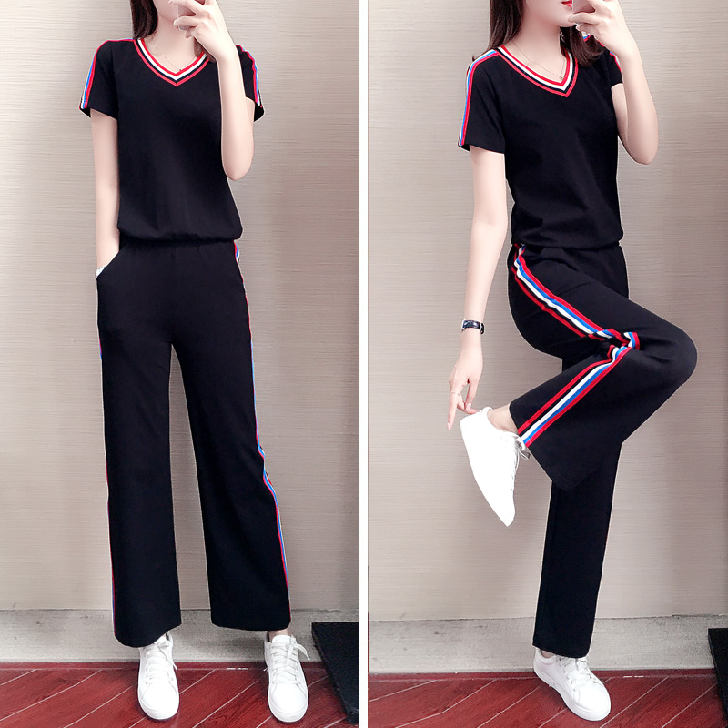 Sports Suit Women Summer 2022 New Fashion Temperament Loose Slim V Collar Casual Wide Pants Foreign Pie Two Sets