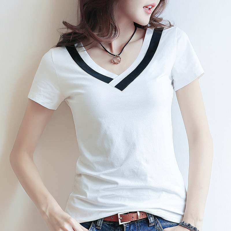 2021 Korea Tide Brand Spring Summer New Fashion V-neck Solid Color Short Sleeve T-shirt Women Cotton Half Sleeve base shirt Loose