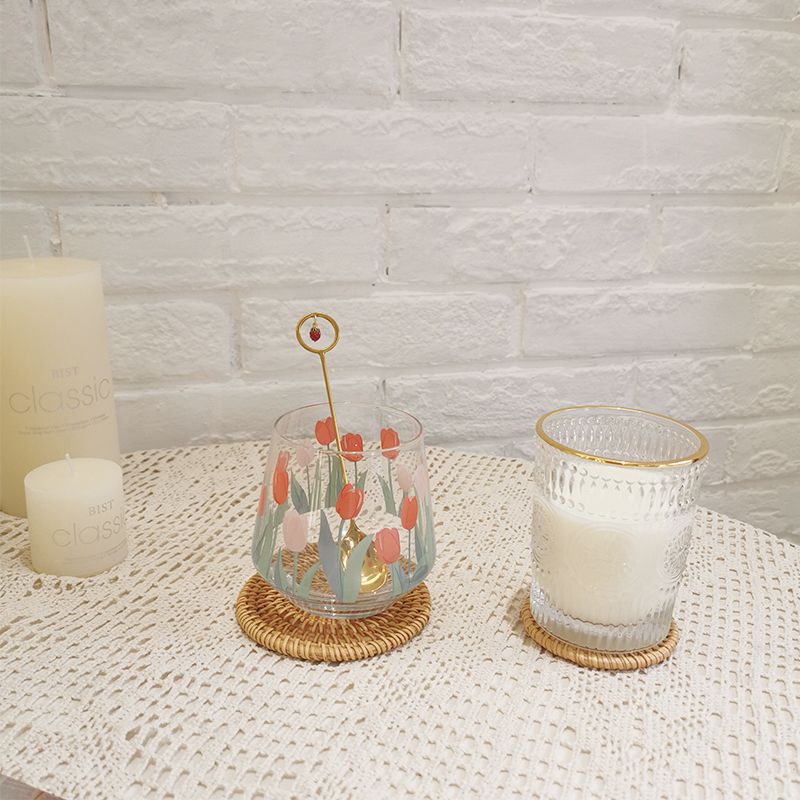 Tulip glass bare cup free stainless steel spoon tulip glass + rattan coaster tulip glass lace coaster tulip glass lace coaster-tulip glass wooden mat tulip