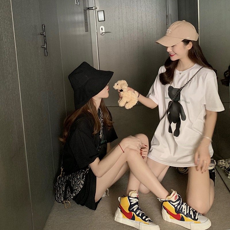 Korean Hong Kong style bear print mid-length short-sleeved loose all-match top super fire ins street couple men and women T-shirt