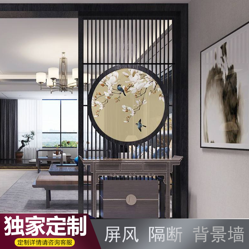 New Chinese modern living room partition entrance hollow carving board solid wood decorative fence transparent yarn painting screen customization