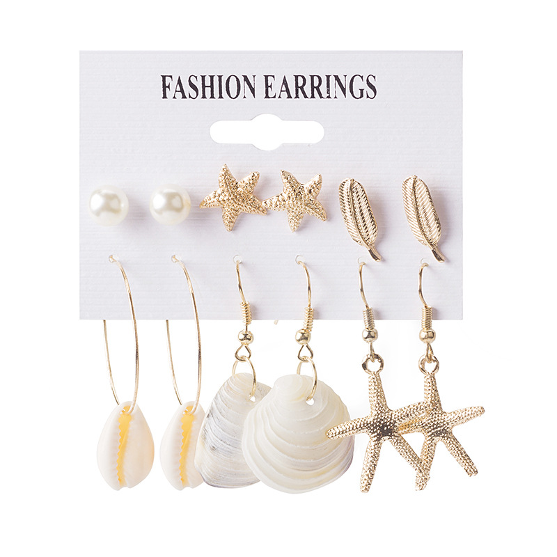 European and American creative fashion personality alloy shell tassel earrings Beach ocean wind conch pearl multi-pair ear needle female
