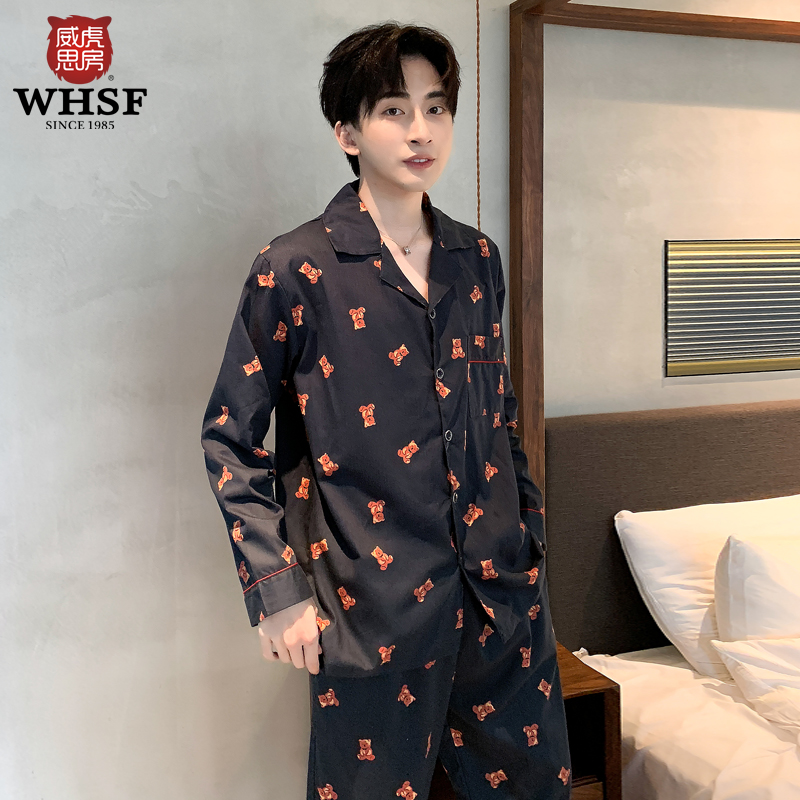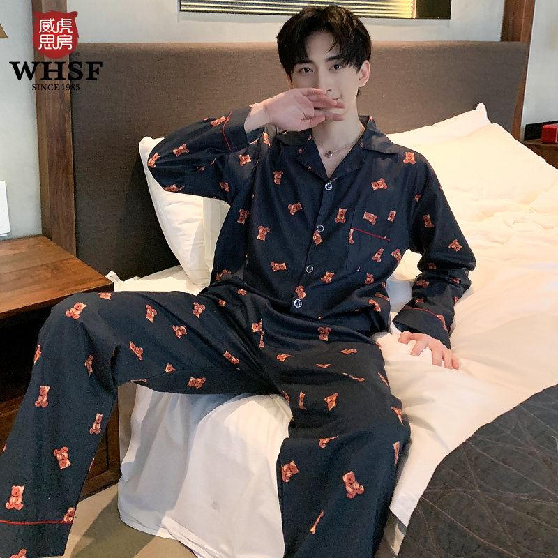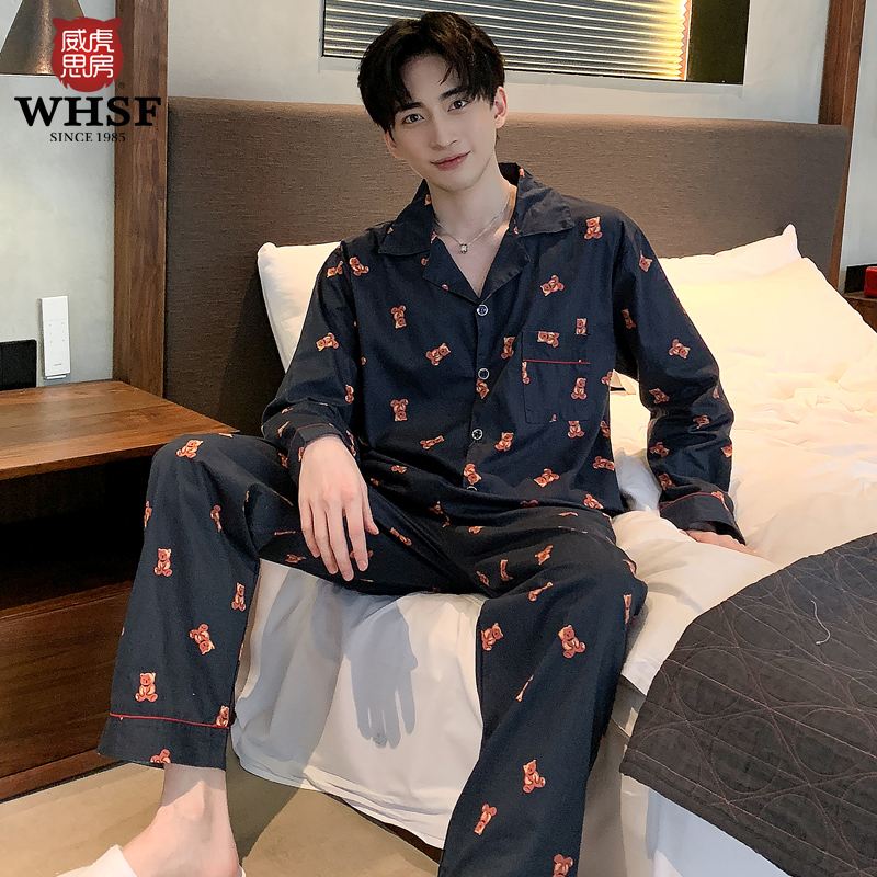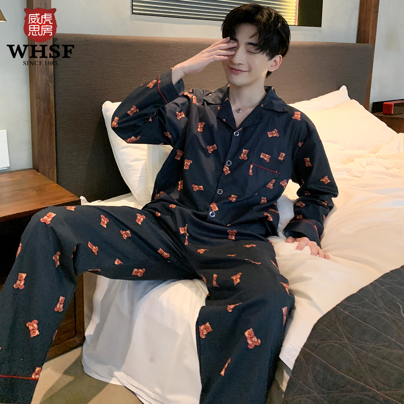 Pajamas men's spring and autumn woven cotton long-sleeved cute cartoon bear anime cotton Korean version of the youth homewear suit