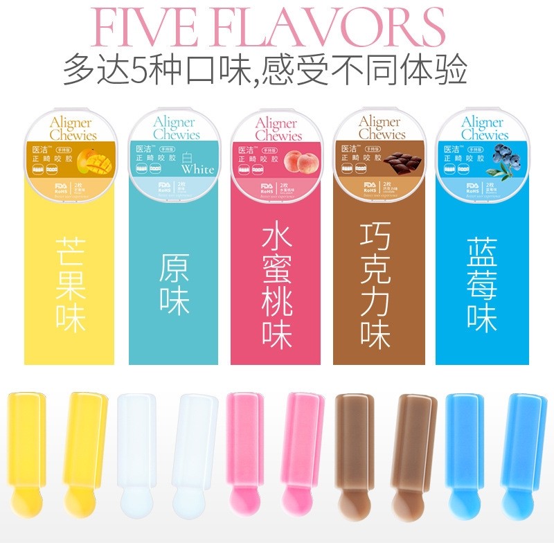 Yellow Mango Flavor (softer) white original flavor (moderate) Chocolate flavor (moderate) pink water honey peach taste (moderate) blue blueberry flavor (harder)