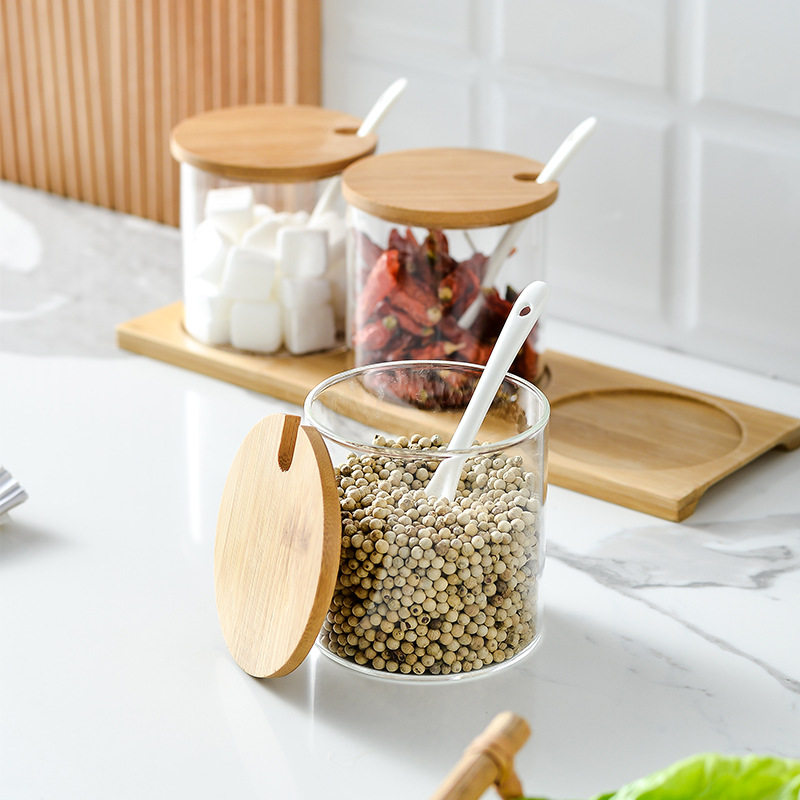 Bamboo Seasoning Jar With Spoon Day Style Transparent Glass Salt Jars Home Kitchen Containing sugar MSG Seasoning Box Combined Clothing