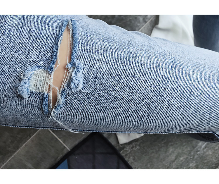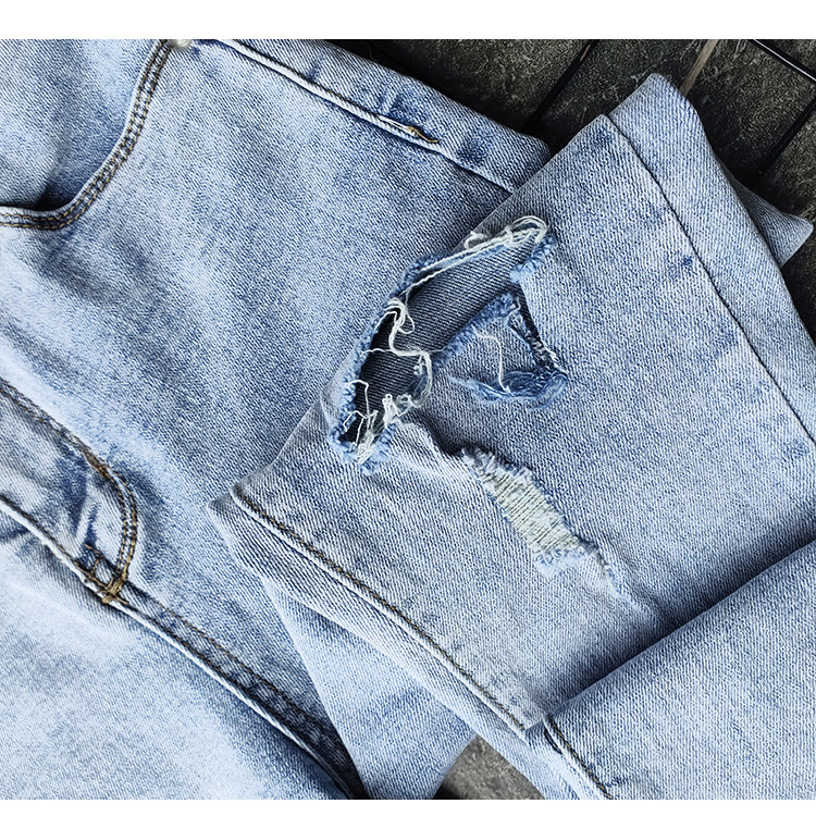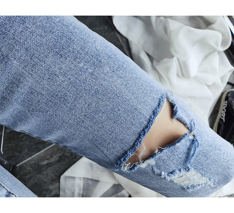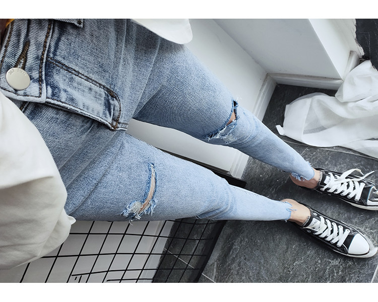 Light blue jeans female spring 2020 new Han Edition high waist big hole, thin blue and white pants nine minute foot pants