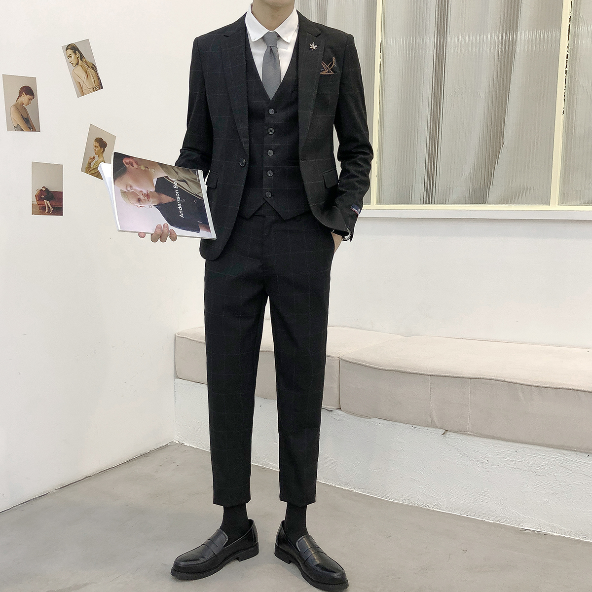 Suit suit Men's slim plaid casual British style groom best man wedding Korean version suit vest three-piece set