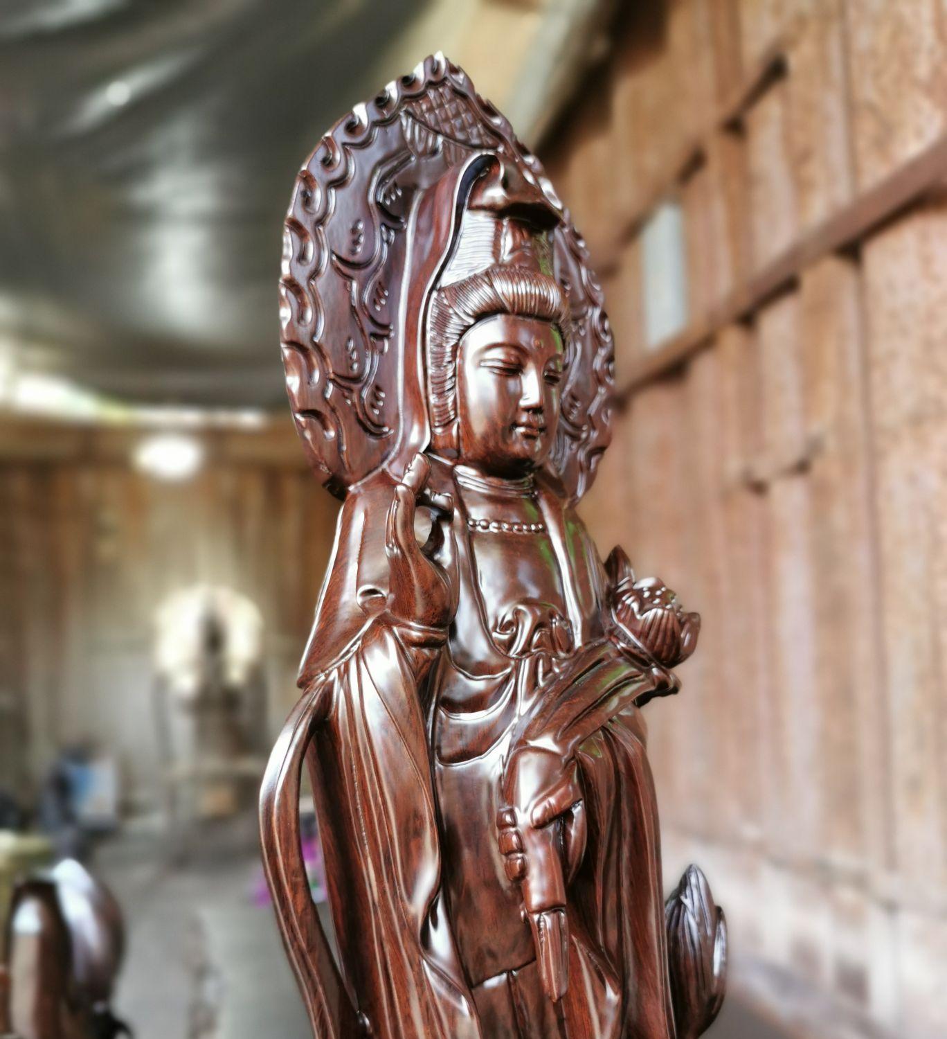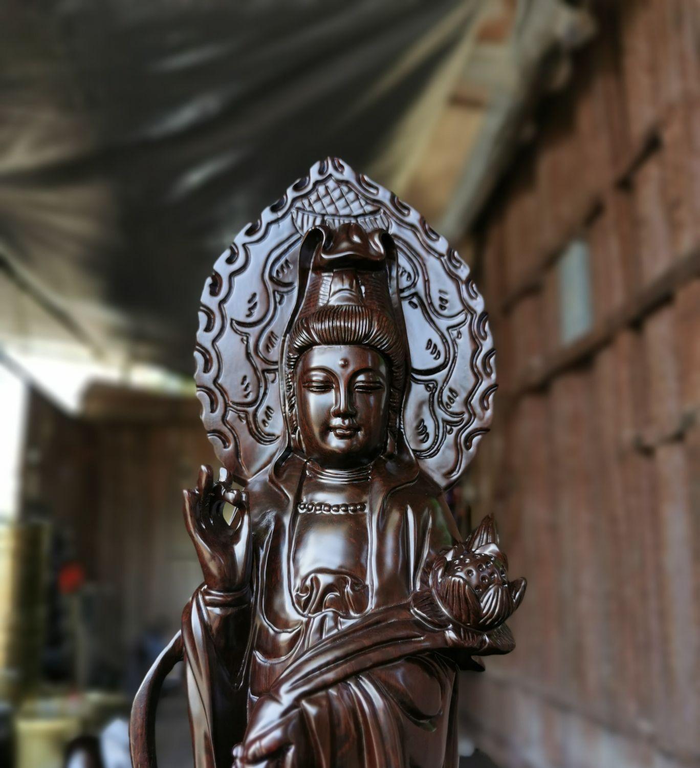 Ebony wood carving Guanyin Buddha statue ornaments solid wood flower fairy aunt Bodhisattva lotus for Buddha home town house to keep safe