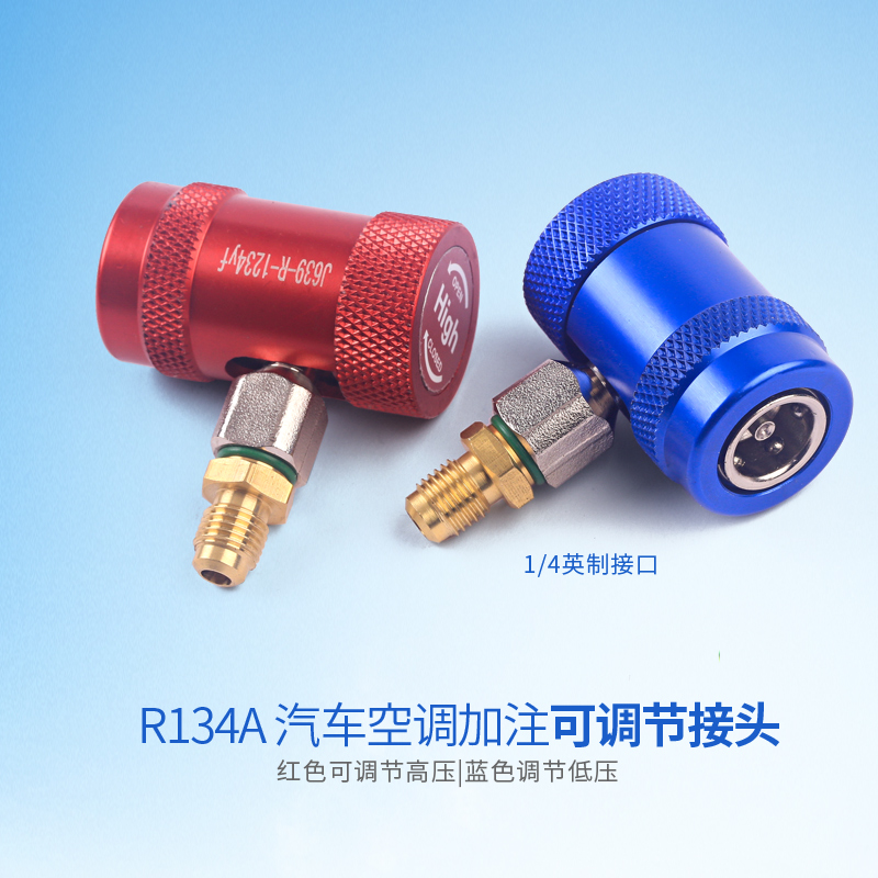 Adjustable low pressure connector One adjustable high pressure connector One low pressure non-adjustable connector One high pressure non-adjustable connector One blue low pressure 90 degree non-adjustable connector One red high pressure 90 degree