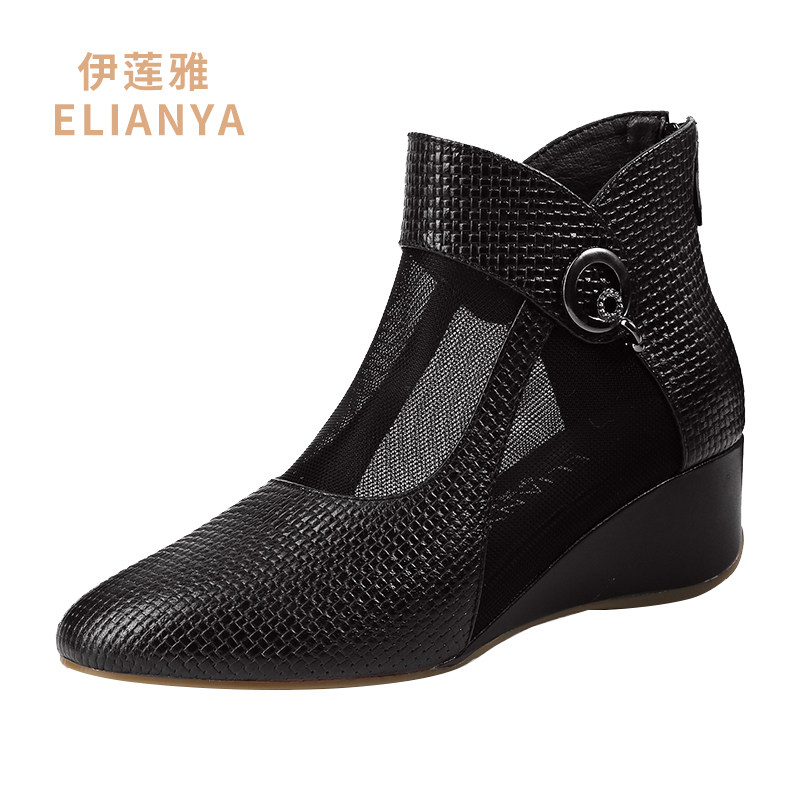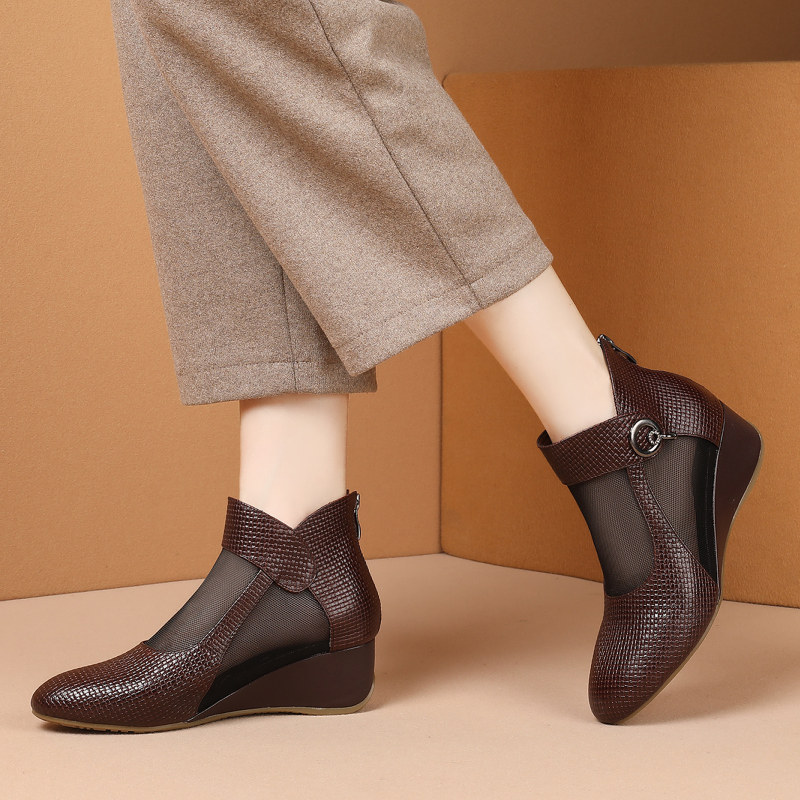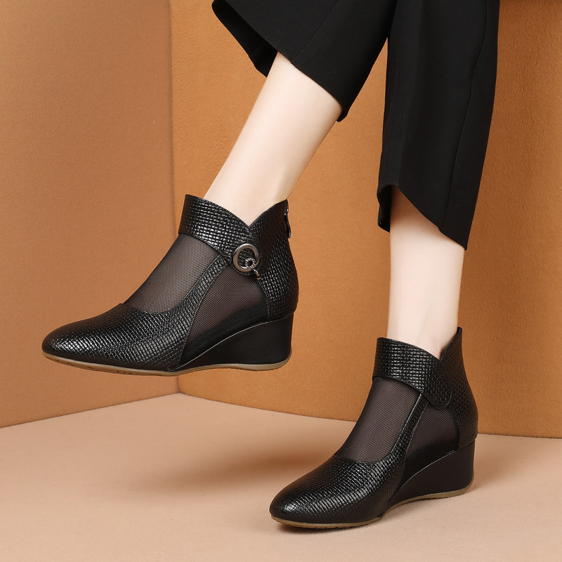 2022 new leather mesh boots women's summer mesh sandals mid-heel wedge mother shoes all-match hollow sandals 40 yards