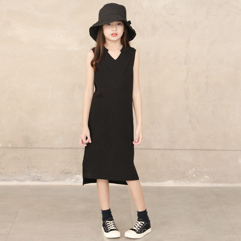 Girl V Collar Temperament Foreign Dress 2022 Summer Brief Black Open Fork Elastic Display Slim Vest Skirt Over Knee Long Skirt