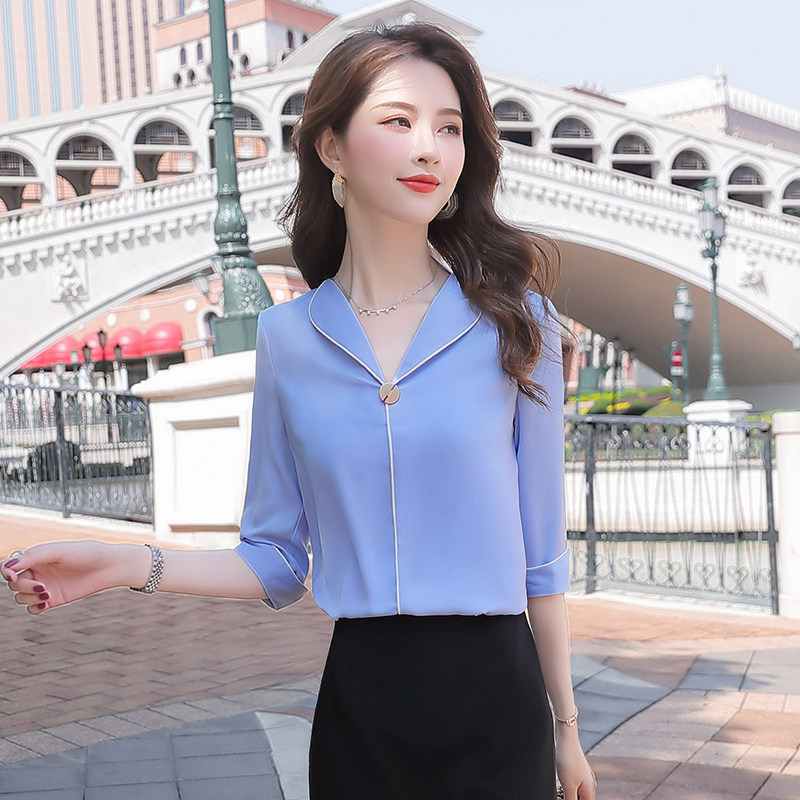 Blue snow-spinning shirt woman 2020 spring and summer new 70% sleeve foreign pie V-neck sweatshirt fashion a very fairy blouse blouse