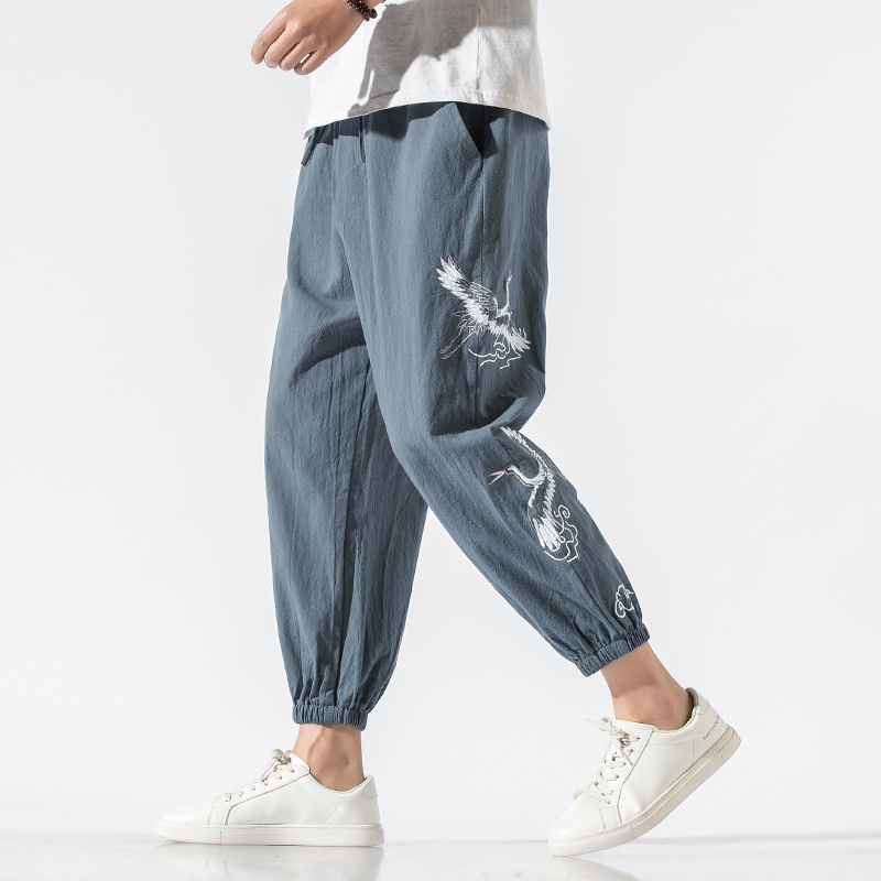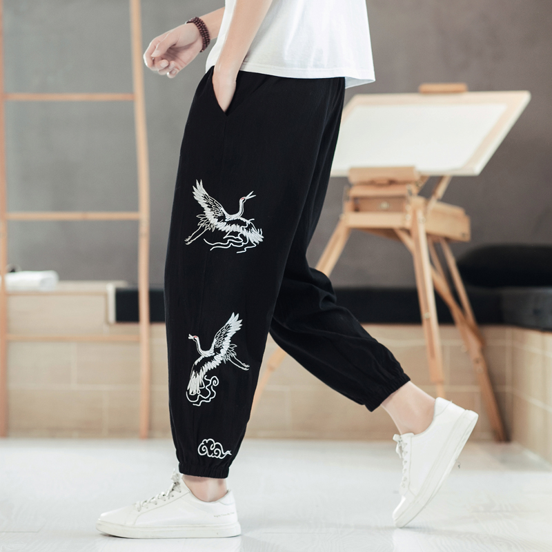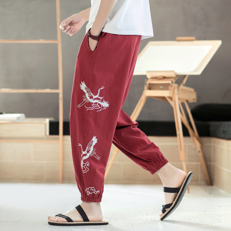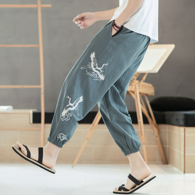 Chinese style men's pants loose casual nine-point pants Spring and summer vintage embroidery beaded Halong pants large size bloomers tide
