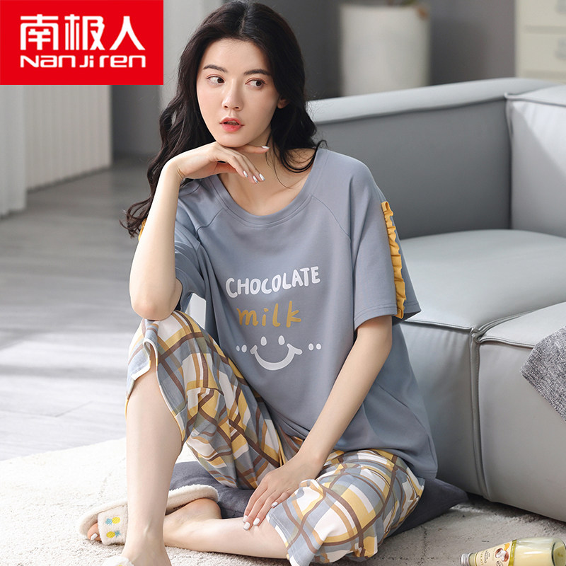 Antarctic pajamas women's summer cotton short-sleeved cropped pants thin section large size loose home clothes spring and autumn two-piece suit