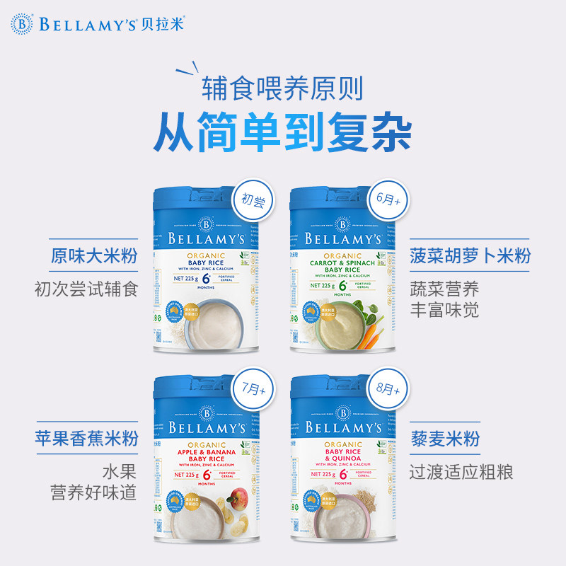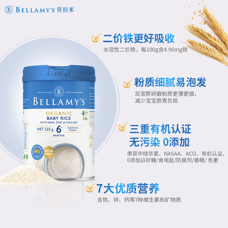 Bellamy rice noodles baby high-speed rail organic baby baby food nutrition rice drum 225g canned original imported