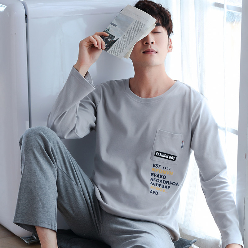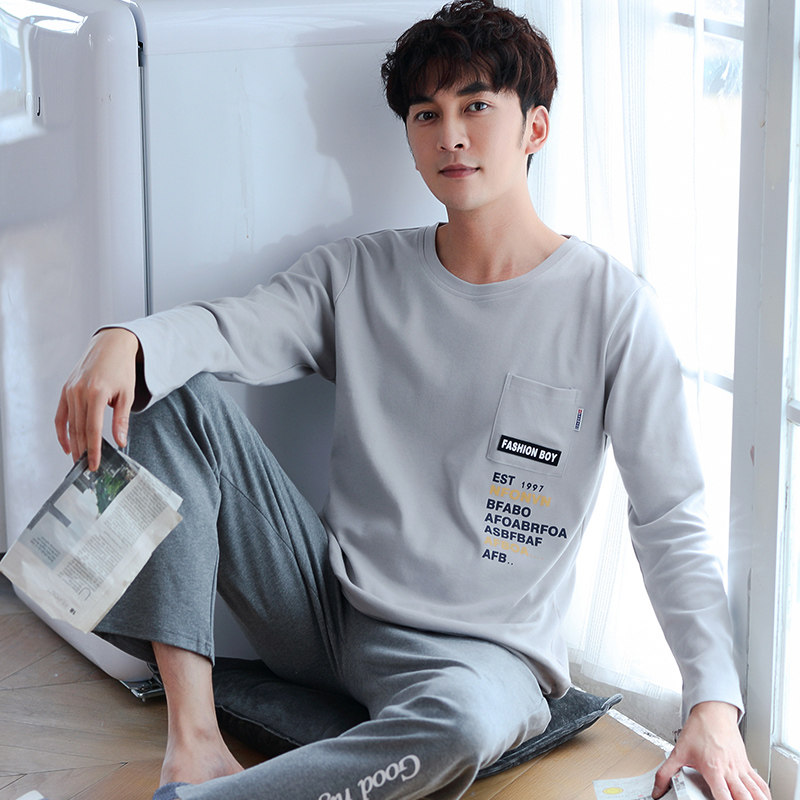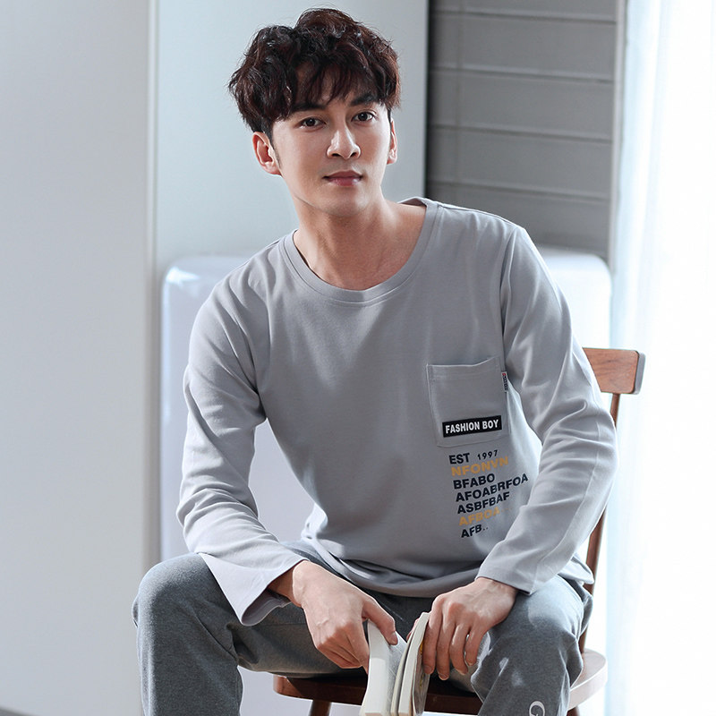 Can be worn outside men's pajamas spring and autumn long-sleeved cotton spring and autumn youth sports large size round neck loungewear set