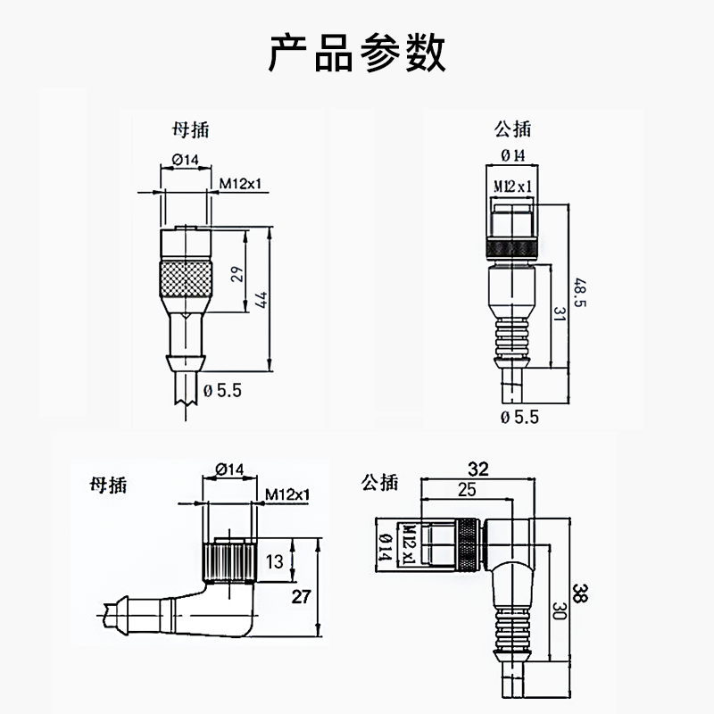 M12 straight mother 4 core -2 m M12 straight mother 5 core -2 m M12 straight mother 8 core -2 m M12 straight male 4 core -2 m M12 straight male 5 core -2 m M12 straight male