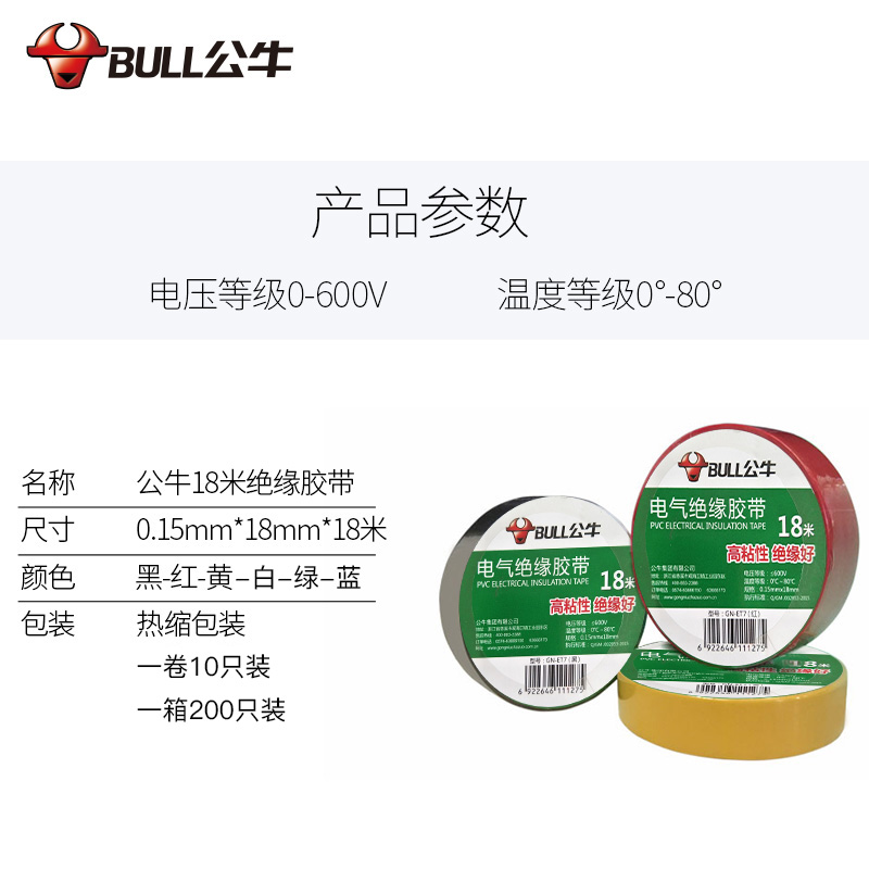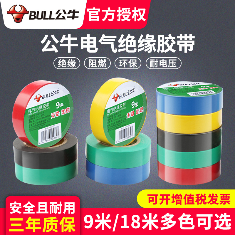 Bull electrical tape PVC electrical insulation waterproof tape High temperature flame retardant black 9 18 meters ultra-thin large roll