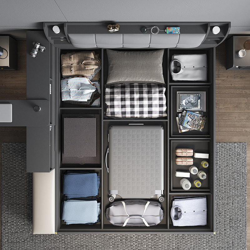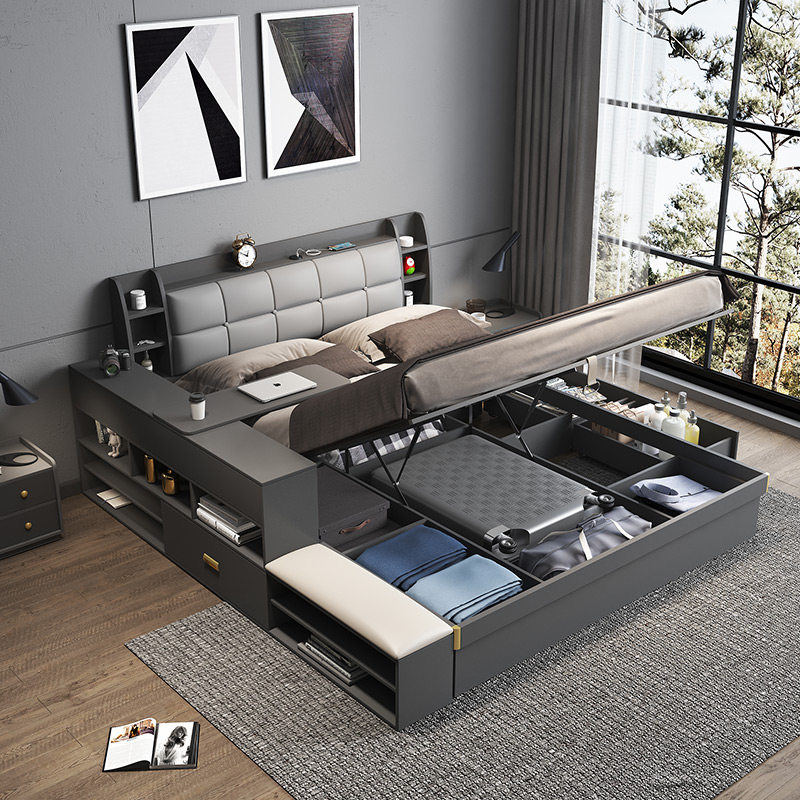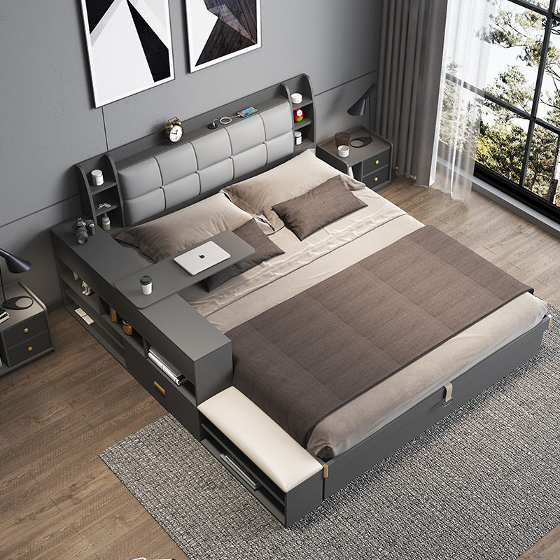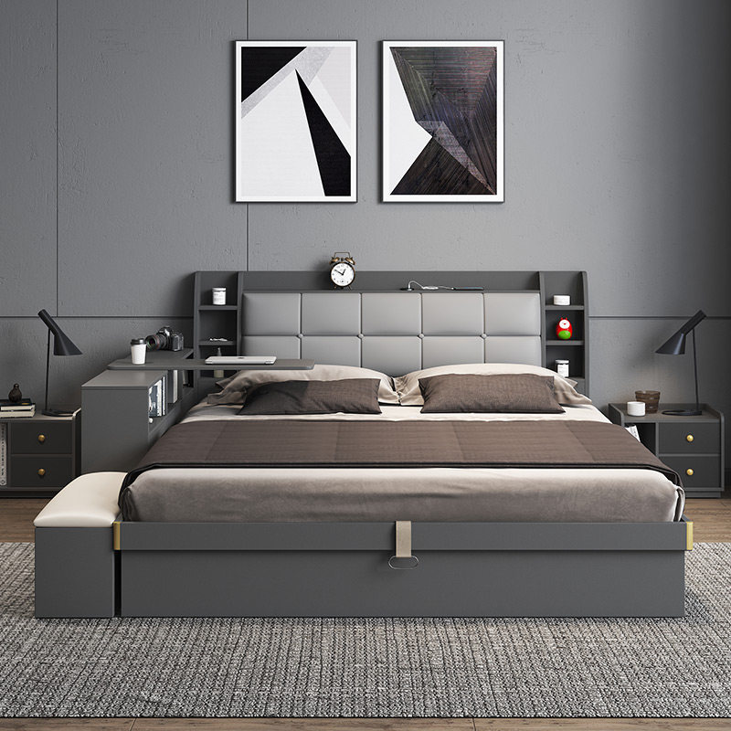Fabric gray high box bed (comes with sensor bedside lamp) Fabric gray high box bed Bedside table*1 Fabric gray high box bed Bedside table*2 Fabric gray high box bed Side cabinet (with rotating table) Fabric pattern