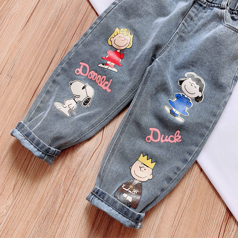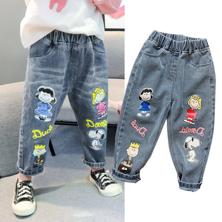 Spring and Autumn Girls Cartoon Printed Jeans Network Red Boys and Girls Leisure Pants Han Children's Clothing in Large Children's Clothing