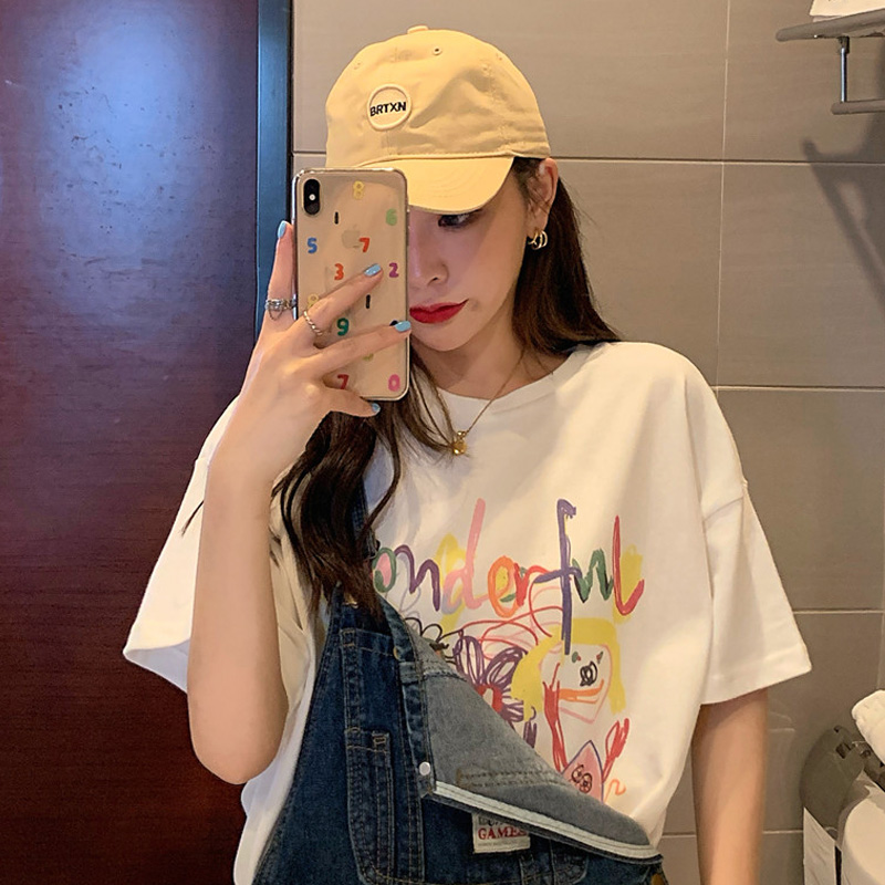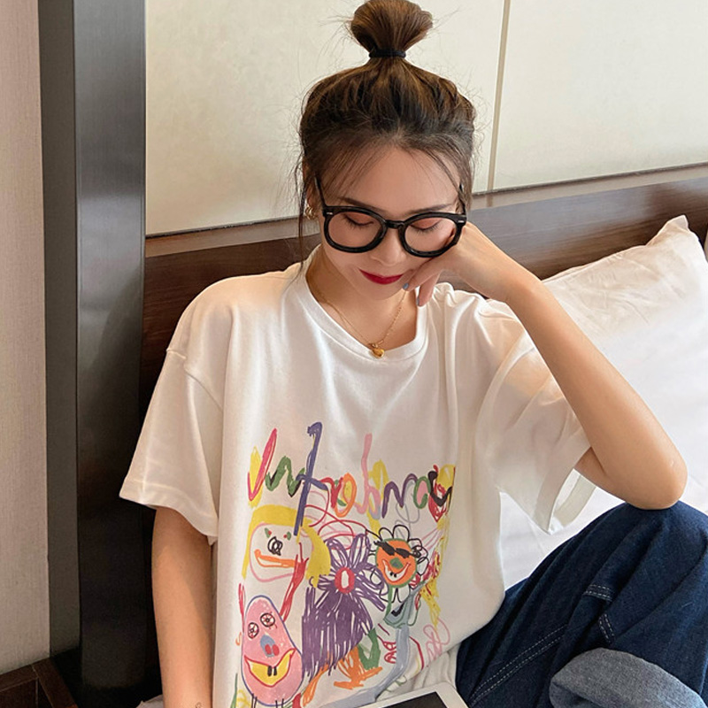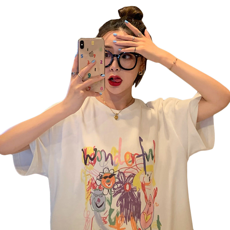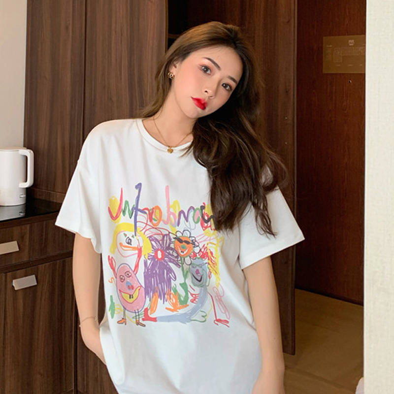 Large size net red and white cotton T shirt 2021 summer in super fire graffiti print loose mid - long - plate coat tide