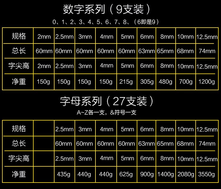 Digital steel stamp steel number steel character code 0-8 English letter steel word nail punch A-Z steel stamp word 2mm-12.5.
