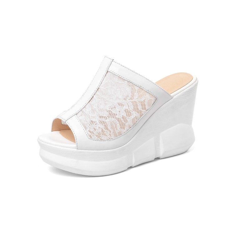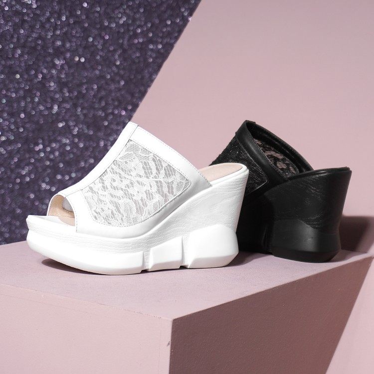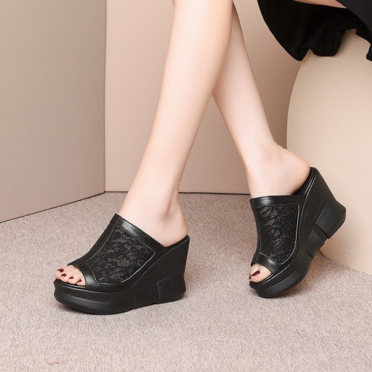 Genuine leather slippers women's outer wear 2022 spring and summer slope heel mesh flip-flops super high thick heel sandals thick bottom women's shoes half drag