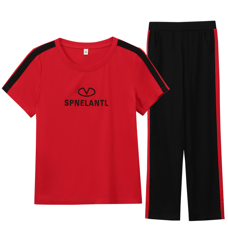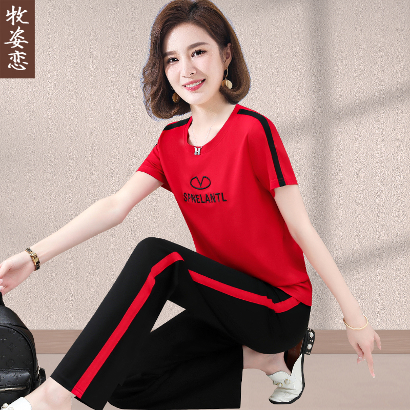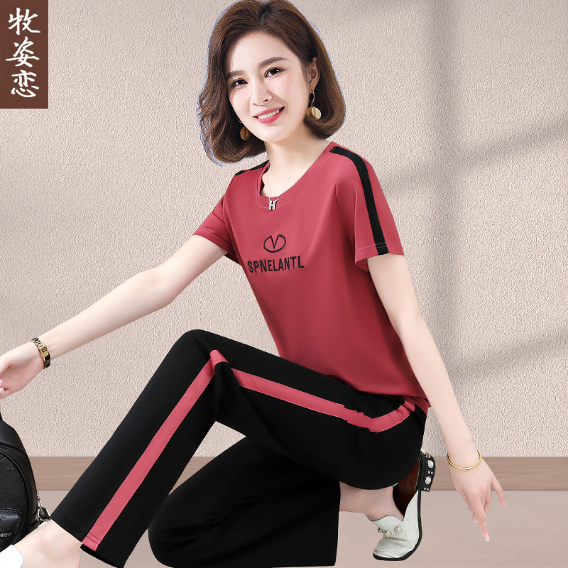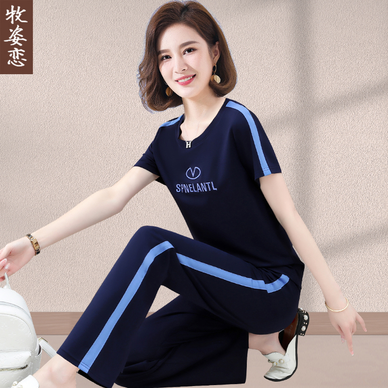 2023 Summer New Ice Silk Short Sleeve Sports Suit Women's Ocean Broadlegged Pants Two Sets Big Code Thin and Casual Wear-Taobao