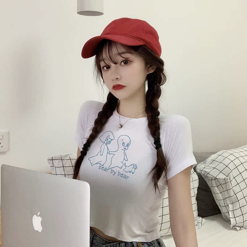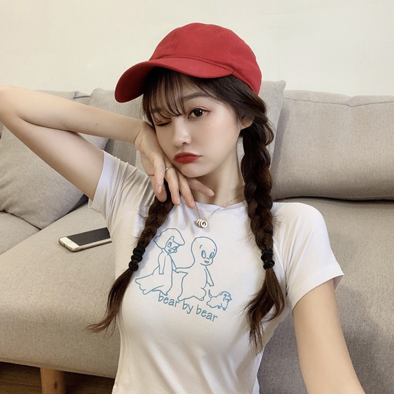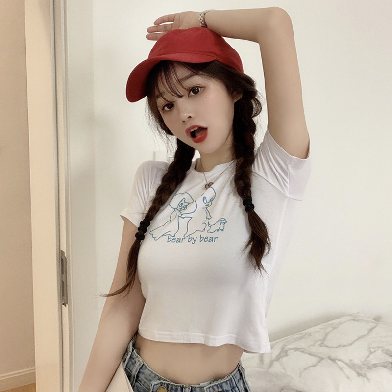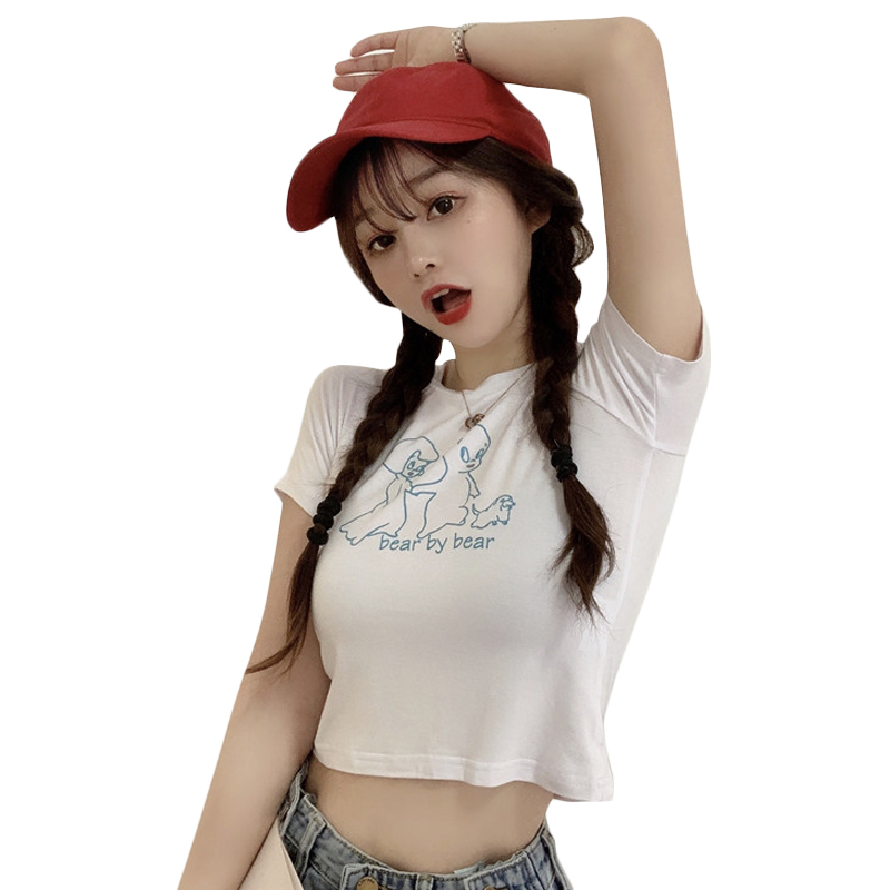 Large size short-sleeved women's slim fit and thin short print white T-shirt women's summer ins girls trendy high waist top trendy